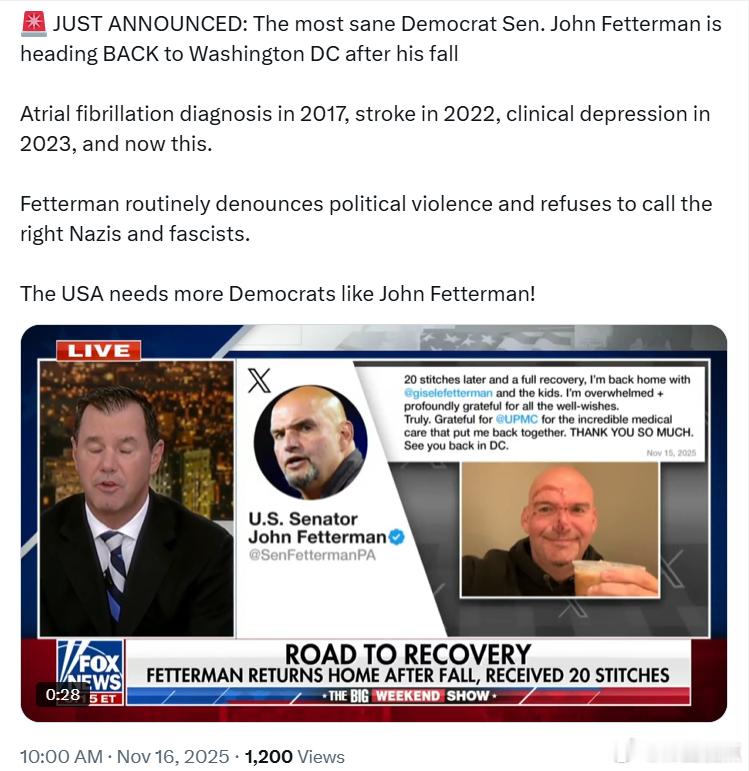 最理智的民左党参议员约翰·费特曼表示在秋季休会后,将重返华盛顿特区。2017 年被诊断患有心房颤动,2022 年中风,2023 年临床抑郁症,现在又有新的健康问题。费特曼经常谴责政冶暴力,并拒绝称右派为纳粹或法西斯。美国需要更多像约翰·费特曼这样的民左党人!