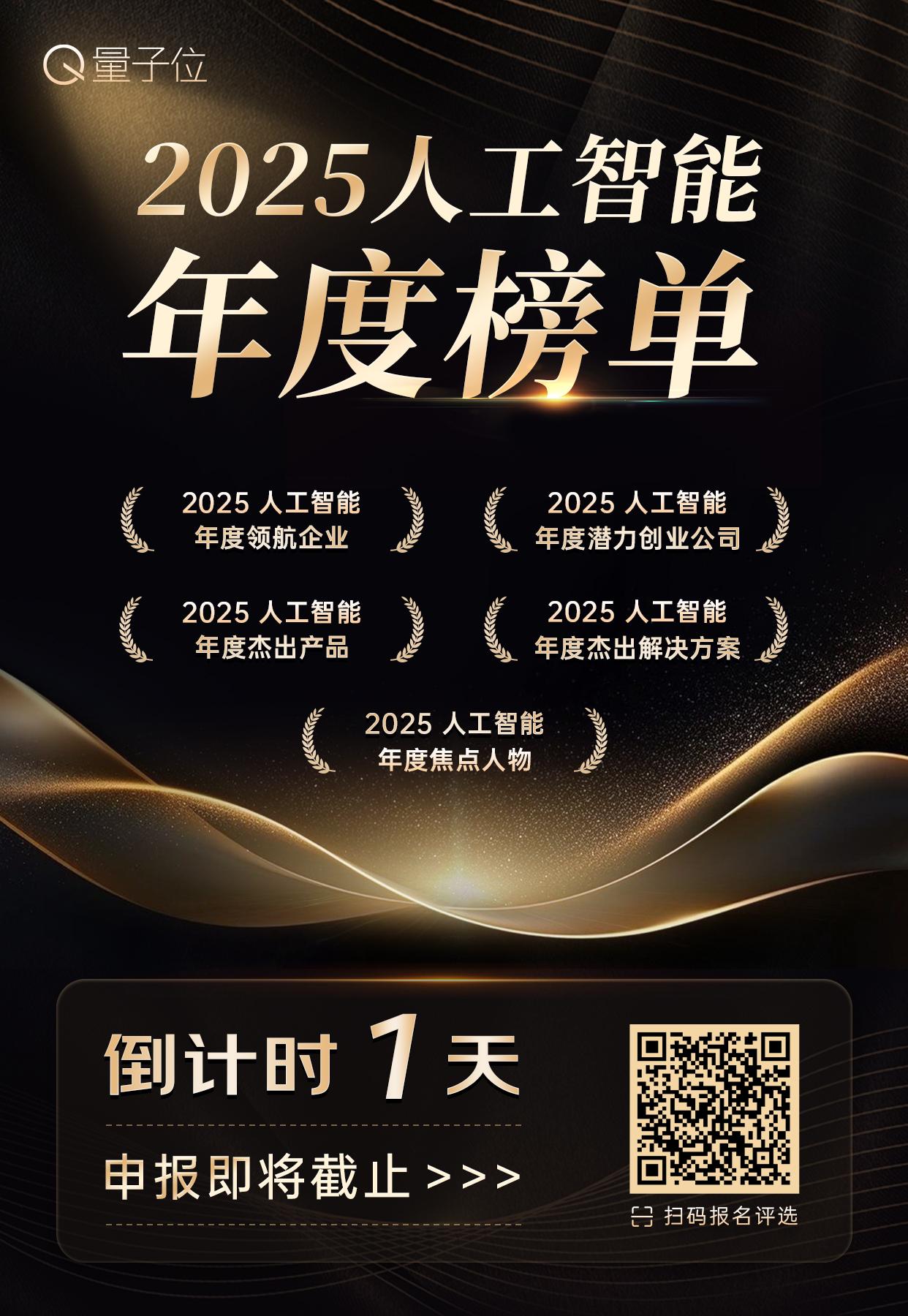 #量子位人工智能年度榜单# 申报只剩 1 天啦~ 不管你是带领企业深耕赛道的领航者、怀揣创新想法的创业人,还是打磨出爆款产品的团队、推动技术突破的核心人物,这都是一次实打实的实力展示机会。 本次评选将从企业、产品、人物三大维度,设立五类奖项。欢迎企业踊跃报名! 🏅 企业榜 🔹 2025 人工智能年度领航企业 🔹 2025 人工智能年度潜力创业公司 🏅 产品榜 🔹 2025 人工智能年度杰出产品 🔹 2025 人工智能年度杰出解决方案 🏅 人物榜 🔹 2025 人工智能年度焦点人物 评选结果将在 MEET2026 智能未来大会正式公布,现在点击链接锁定资格→