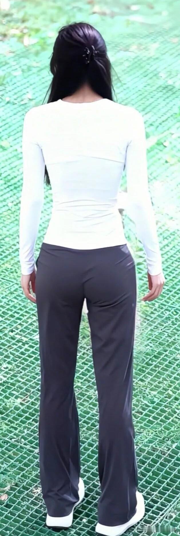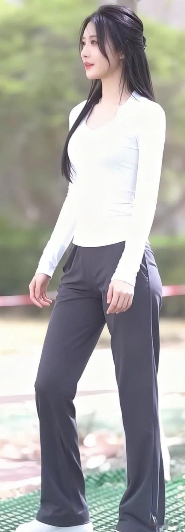 白上衣+灰长裤的搭配好清爽!长发披肩、笑意温柔,随手抱件外套都自带松弛感。