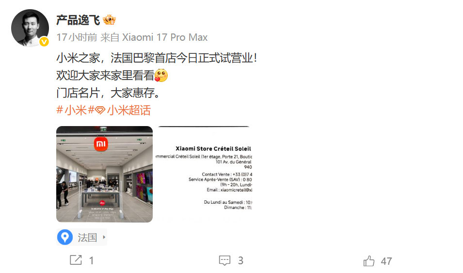 【】IT之家 11 月 16 日消息,小米法国副国家经理 昨日发文宣布小米之家法国巴黎首店正式试营业,并分享门店照片。此前有网友提出“之前不是在香街有一个吗?”的疑问,产品逸飞回应称:“之前是客户开的店,由于疫情暂时退出了。”据悉,这家小米之家为直营门店。IT之家查询获悉,2018 年 5 月,小米正式宣布进入法国市场,第一家小米授权店正式开业,店铺位于巴黎市第一区的 Sébastopol 大道。小米同时带来小米 MIX 2S 和红米 Note 5,以及生态链产品小米电动滑板车。小米当时宣布将与线下合作方,包括 FNAC、DARTY 和家乐福等,为法国市场带来一系列产品。
