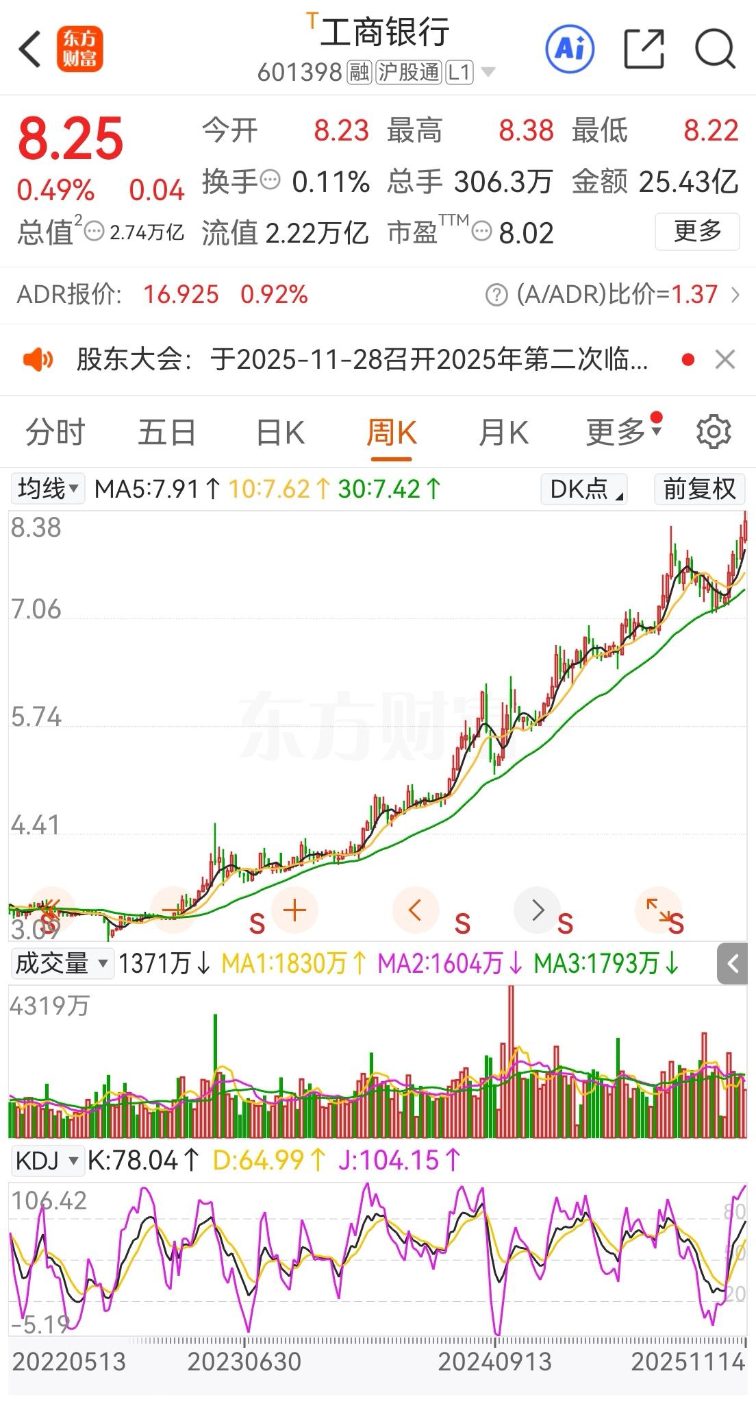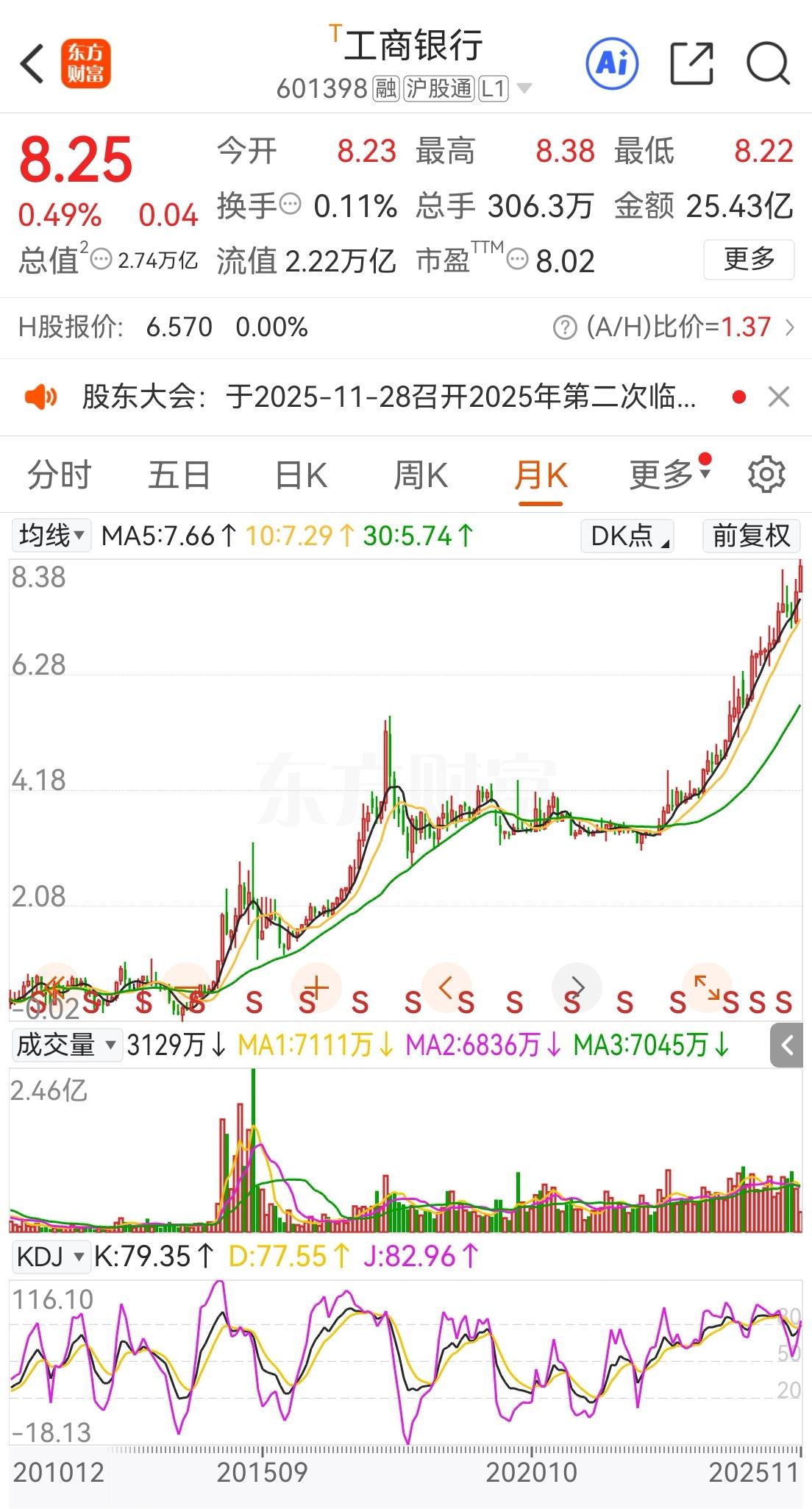 有人说你预期大盘指数回调为啥不把股票都卖了?地产泡沫之后,能带来稳定回报的资产也就是股票了,而且上市股票中能有确定性赚钱的股票并不多,100~300只,更多的股票并不能长期放心持有。假如大盘下跌10%或20%,这是不可预计的事情,也就是说,卖出股票之后你不知道什么时候买回来,或者你卖出的股票是不是真的就下跌也是不确定的事情。持续盈利的股票,股价变化趋势总体向上但波浪式前行,买价足够低就能获取合理回报,更多的小波浪的钱就放弃,否则很容易把股票折腾没了。比如工行,放在股票池十多年,2013年买入、2018年卖出应该相当不错,2022年买入、2024年卖出之后回调又买入,今年刚过7元卖出,现在资金富余了但是股价8元多了已经没有机会再次买回来了。股票足够熟悉但是仍然出现如此状况,每次操作都不错,拉长时间发现是做了无用功。