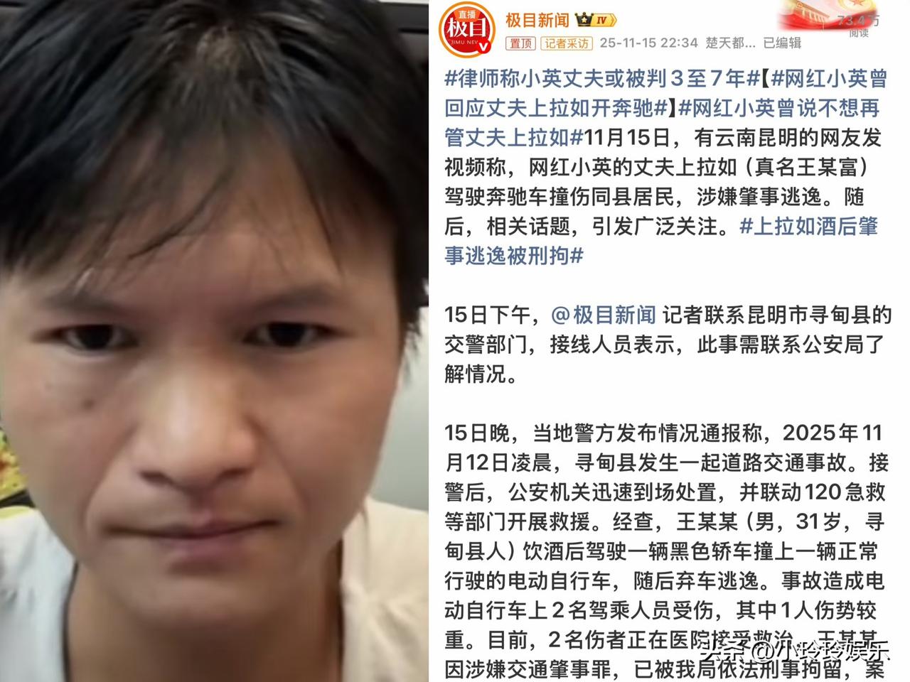 网红小英的丈夫上拉如 喝完酒开着奔驰撞伤同县老乡后 居然直接 弃车逃逸。 喝酒不开车这话都说烂了,偏有人当耳旁风,撞人不救还跑路,这性质太恶劣了,必须重判没商量。 这世界其实挺公平的,都说财富和能力不匹配的时候,强行攥在手里也没用,福气早晚会以另一种方式流走,这话放上拉如身上真是太贴切了,现在看来这结果也算是意料之中。
