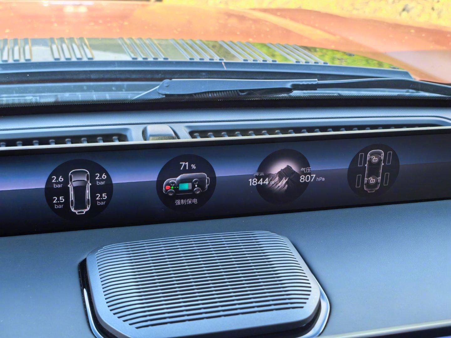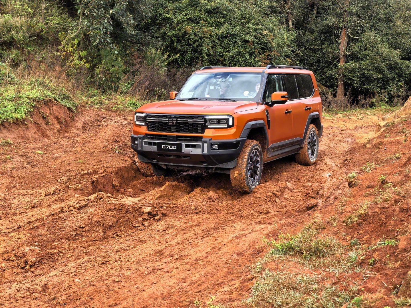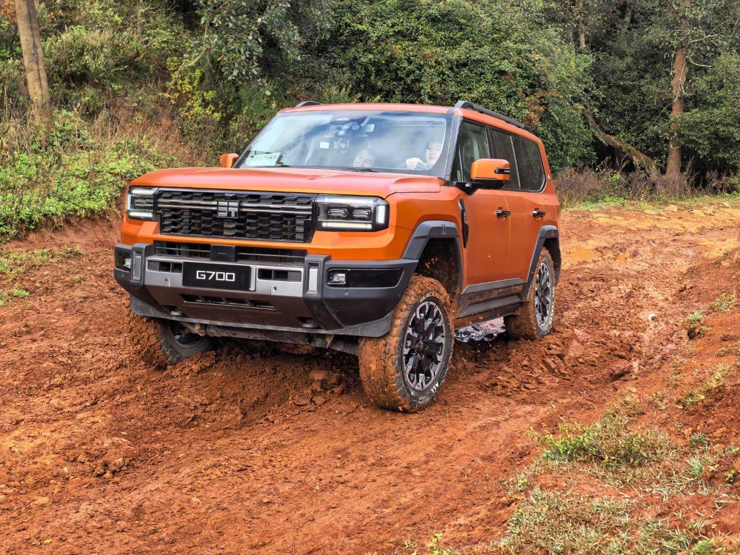 纵横G700的硬越野配置足够混蛋:空悬升最高离地有320mm,很高。970mm涉水。前后硬锁。后桥低速扭矩放大挡。大梁。底盘原厂2mm钢护板。天际屏常驻越野信息,直观。前后拖车钩直接外漏,好用!100升超大油箱,续航老猛。