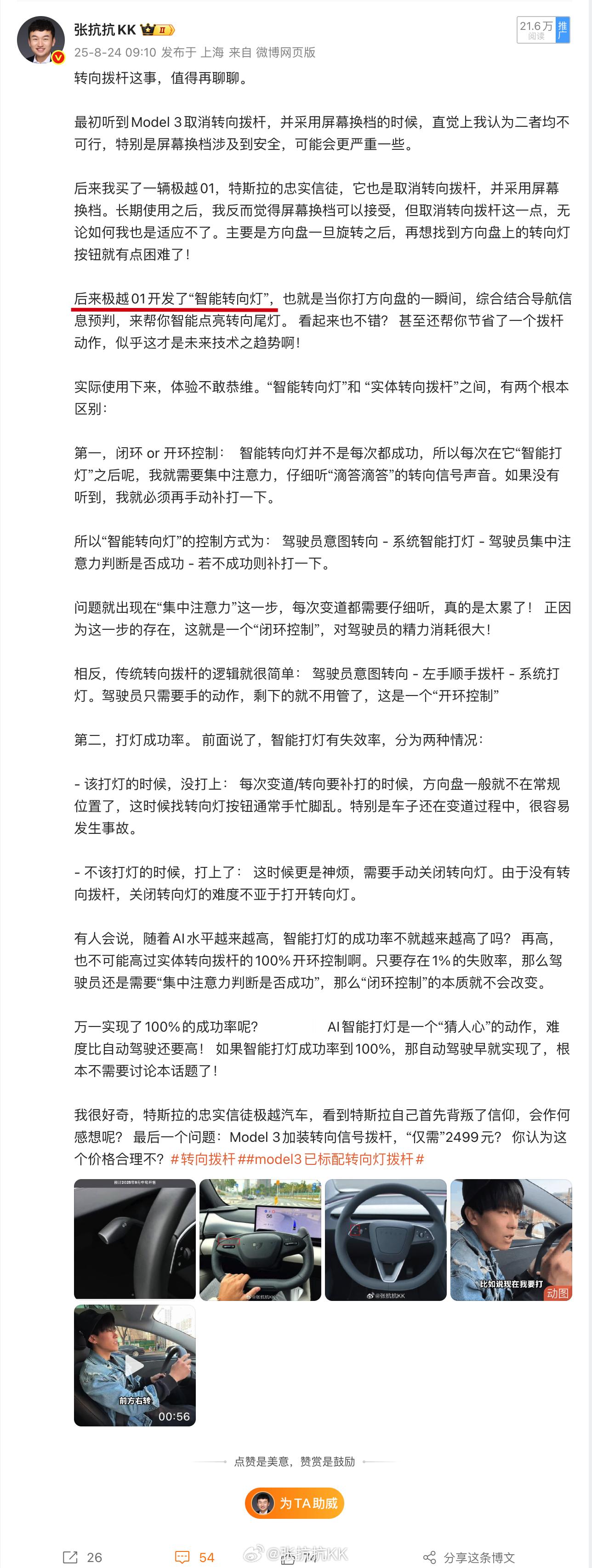 智能转向灯,这功能还挺不错。昨天开高山7,快到家时车速慢,我单手开车。遇到左转,要抬起本已放下的左手再去打灯。就在那一刻,高山7的左转向灯自动亮了。如此就解放了我的左手,那一刻感到异常轻松 —— 智能转向灯功能,真的好啊!但有趣的是,我突然想起三个月前讨论极越取消转向标杆那件事时,我曾批判过“智能转向灯”【图2】。如今却又在心中夸它,岂不是自相矛盾?于是我开始想,这两者的本质区别到底在哪。我想到智己的“视野补盲”功能【图3】——打灯时屏幕会显示侧后方影像,补足外后视镜的盲区。它好用在两点:一是算法能优化雨夜画面,看得更清楚;二是画面离得近,不用转头就能看到。平时转头也不算累,但一旦习惯了“目不转睛”,那种轻松感就让人上瘾。从逻辑上看,“视野补盲”很像“电子外后视镜”,但我对前者评价更高。区别在于——“视野补盲”是补充,不是取代。它在保留实体镜的前提下,提供了额外选择;而“电子外后视镜”则是直接替代掉了传统习惯。为什么也有这种差异呢? 因为“视野补盲”还有实体外后视镜兜底,它是给了我一种额外方式、而不是替代原有的习惯。高山7的智能转向灯同理。它给了我一种新的方式,但没取消转向杆。左转、右转它会自动亮,而在变道超车等场景,仍然由驾驶者自己控制;就算偶尔失误,我也可以下意识用实体拨杆补上,非常轻松。 回忆起极越的智能转向灯,其实左转和右转时也好用,只是在“变道超车”时经常让人手忙脚乱。再说到智己那块屏幕布局——我其实并不喜欢那种非常规的设计。但偏偏“左侧视野补盲”又依赖这种布局。我这是不是又自相矛盾?我想,其实不。智己的屏幕布局选择,有历史因素在里面,这不是智能座舱部门能决定的事情。他们能做的,就是在布局已定的前提下,去尽可能地适应难点、发挥优点。他们在此基础上开发了“视野补盲”,这就是他们的应对之策:手里有步枪,就拿步枪去打仗。效果不止补足缺点,甚至打出了卖点。有步枪的时候就拿步枪打,那么有火炮的时候,是不是应该把火力给到最足? 屏幕布局换代这件事情,我从智己L7的时代就开始期待,但也知道好多年后才能换。今年终于能换了,我默认是换成了中控大屏或副驾双联屏的布局,非常期待,结果整成了图4的这样子:- 仪表虽大,但会被圆形方向盘遮挡;- 中控屏为了和仪表双联,导致尺寸较小;- 副驾屏的尊贵感倒是给足了,面积大、视距远、视角爽,肯定看得很爽。这样的布局不是不好,只是独特的设计意味着额外的工作量。屏幕不是装上就完事,还要适配UI、重做交互、配合营销内容。若能打出差异化固然精彩,但在资源紧张、竞争激烈的当下,这样的冒险也要有足够的底气。