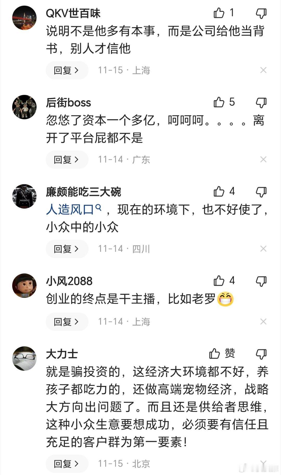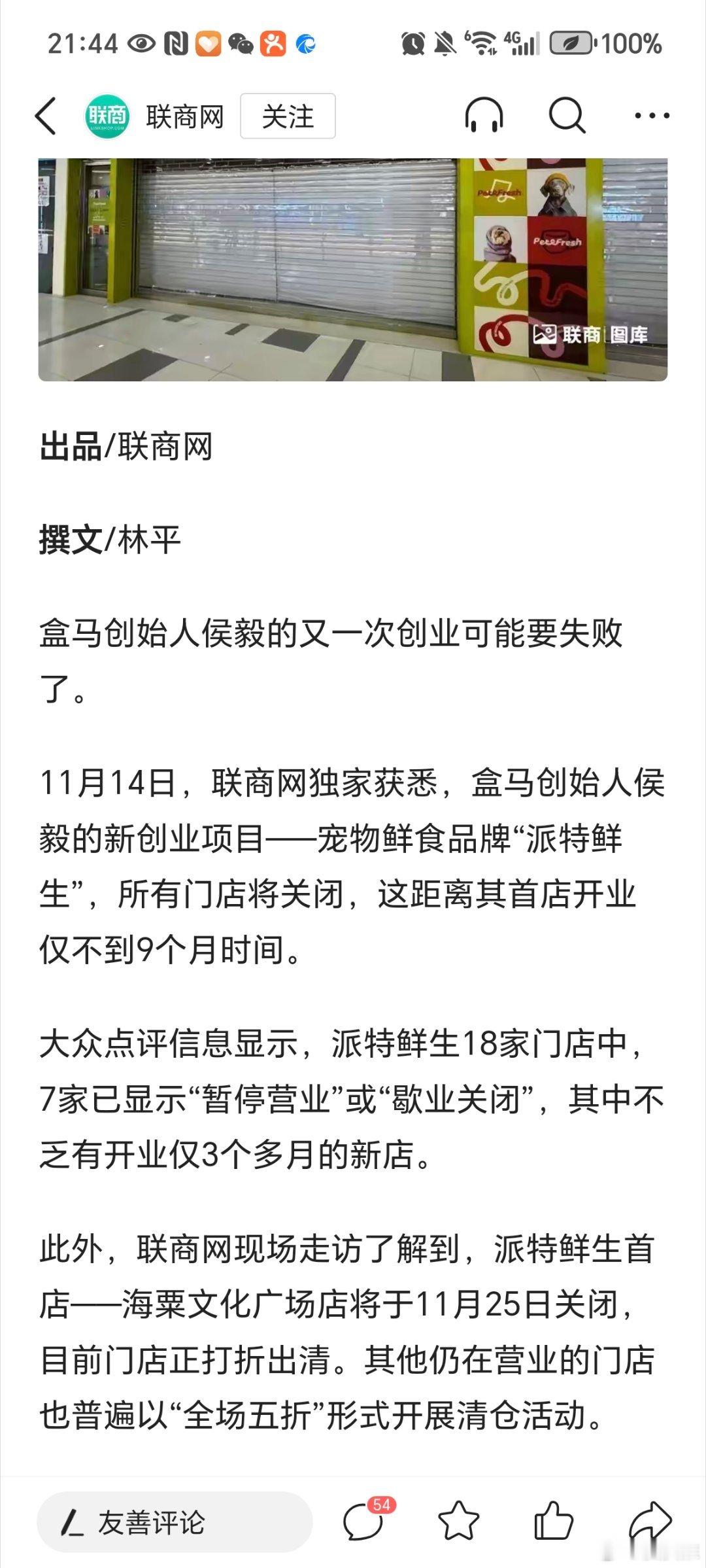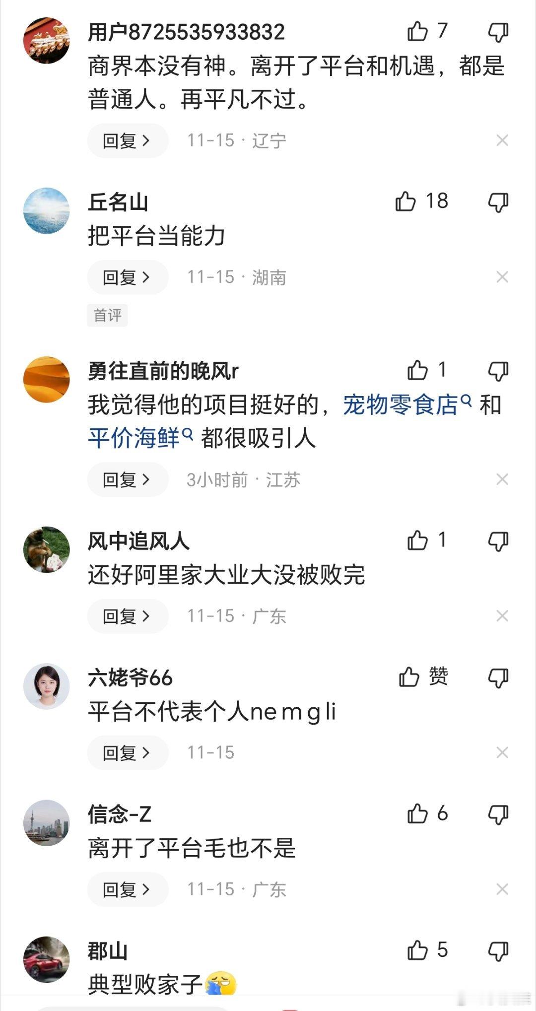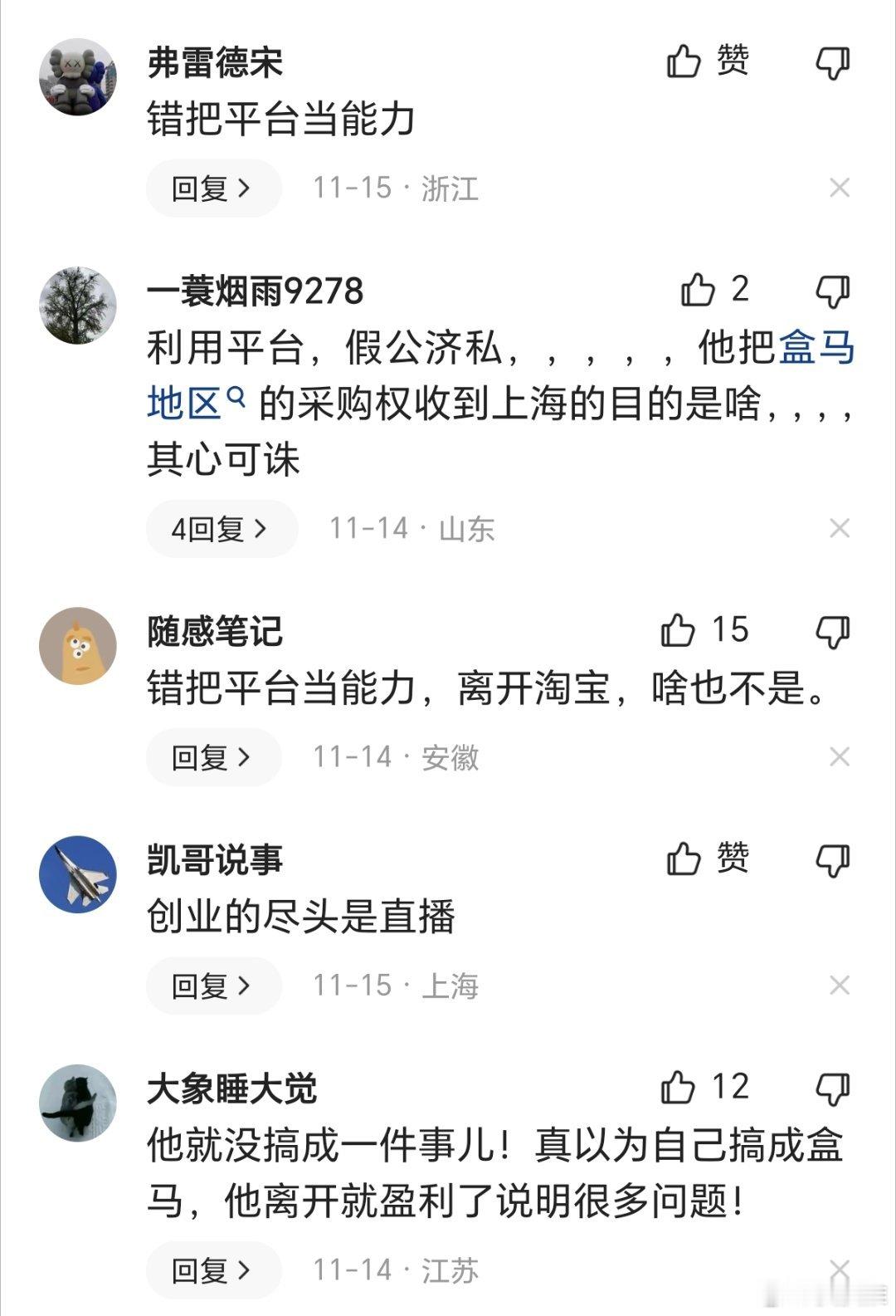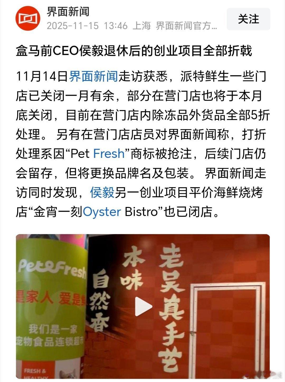 盒马前CEO侯毅离开阿里后,一直想证明自己,然而现实是残酷的,据界面新闻和联商网的报道,他退休后的创业项目可能又要失败了。网友评论:商界本没有神,离开了平台和机遇,都是普通人,再平凡不过。也有网友觉得他不过是又一个错把平台当能力了的人。看他的朋友圈要去做直播带货,这是在向罗永浩致敬吗创业的尽头是直播带货。