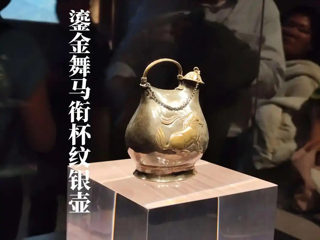 陕历博牛逼的文物多,但也不是每件文物都敢说自己是镇馆之宝。而这件1970年出土的鎏金舞马衔杯纹银壶,完全可以双手叉腰说自己是陕历博镇馆之宝里的宝。它是第一批禁止出国(境)展览的文物之一。鎏金舞马衔杯纹银壶高18.5厘米,重549克。整体造型模仿了北方游牧民族使用的皮囊壶。为啥长这样?这充分体现了大唐的“国际范儿”,兼容并蓄,把胡风胡韵拿捏得死死的。这把壶身上的“舞马”可不是一匹普通的马,它正屈膝俯首,叼着一个酒杯,姿态恭顺,仿佛在说:“陛下,您随意,我干了!”这样的场景,不是艺术幻想,而是唐玄宗时期真实存在的“大型明星马团建活动”!根据《明皇杂录》等史料记载,每年八月五日玄宗生日(当时叫“千秋节”),老李都会在兴庆宫举行盛大派对。压轴节目就是:训练有素的“舞马”身披锦绣,佩戴金银珠玉,随着《倾杯乐》的节奏,昂首摆尾,起舞应节。曲终时,领头的舞马会跃上三层高的板床,大力士举起床板,舞马衔起地上金杯,为皇帝敬酒祝寿。所以,这把银壶,就是这场“天字第一号生日派对”的限定款纪念品!壶上舞马的瞬间,定格了大唐最奢华、最会玩的一刻。银壶的制作工业特别复杂,简单说就是一个银壶的诞生 = 锤揲塑形 + 錾刻雕花 + 鎏金炫富。是大唐国力、科技与审美三位一体的体现。唐朝人主要是喝低度的米酒或者黄酒,口感偏甜。味道应该跟现在陕西的酬酒差不多,但也有来自西域的葡萄酒,属于进口高端货。这把银壶的主人非富即贵,当时应该用银壶装葡萄酒多一些(个人猜测)总之这件鎏金舞马衔杯纹银壶非常珍贵,是陕历博的明星文物,也是唐朝电视剧里的老演员。
