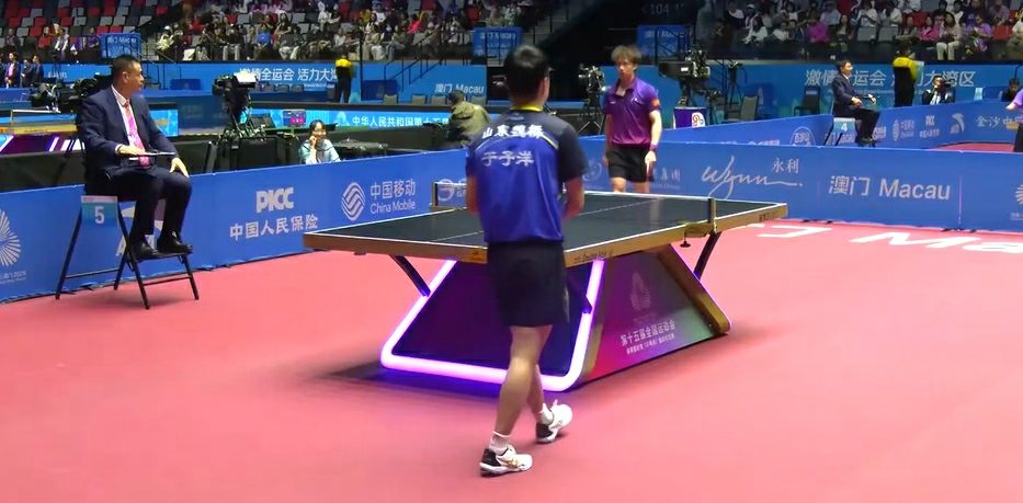 全运会乒乓球男子团体小组赛C组,广东VS山东,第三场,林高远3比2于子洋,帮助广东队大比分2比1领先。第四场,周启豪vs刘丁硕。【4-11、11-8、11-6、9-11、11-5】