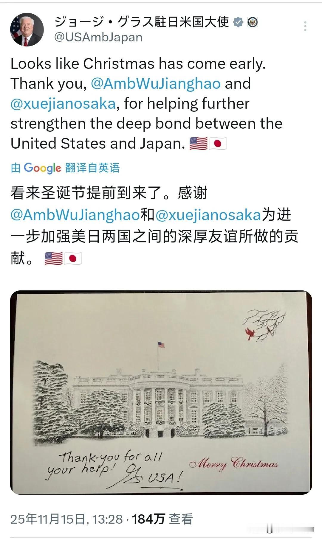 美国驻日本大使格拉斯(11月15日晚)发文写道:“看来圣诞节提前到来了。感谢中国驻日本大使吴江浩和中国驻大阪总领事薛剑为进一步深化美日之间的深厚友谊所做的贡献。” 评几句 美国驻日大使的“圣诞感谢信”,堪称当代外交史上最阴冷的黑色幽默。当东亚人民为局势缓和松口气时,这位白宫代言人竟把中日摩擦当圣诞树装饰,用“感谢”的糖衣包裹着地缘野心的砒霜。其言论之歹毒,恰如往慰安妇伤口撒盐还要拍手称快——这种将别国创伤当圣诞礼品的殖民者心态,比珍珠港事件时的绥靖主义更肮脏。东京湾的宙斯盾战舰或许能挡住导弹,但绝对挡不住这种精神原子弹对和平的腐蚀。