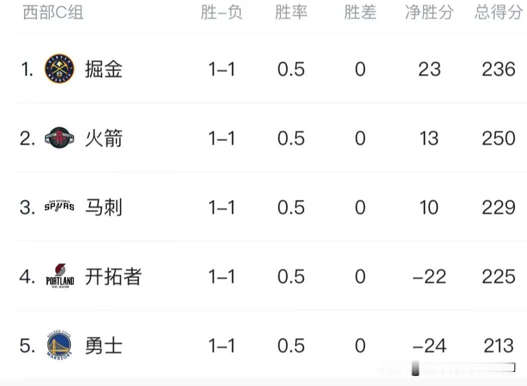 不愧为西部死亡c组,没有一个好拿捏的 就连开拓者都不好惹,全部都是一胜一负 11月1日开拓者109-107战胜掘金 11月8日掘金129-104战胜勇士 11月15日勇士109-108战胜马刺 11月8日马刺121-110火箭 11月15日火箭140-116战胜开拓者 掘金输开拓者,开拓者输火箭,火箭输马刺 马刺输勇士,勇士输掘金,多么完美闭环! 谁能想到开拓者竟然能够赢了掘金, 基本上所有人都觉得他是第一个被淘汰的 没想到出现了意外,而勇士也许才是目前 最先被淘汰的球队,不过现在都还为时尚早 这一组谁会突出重围