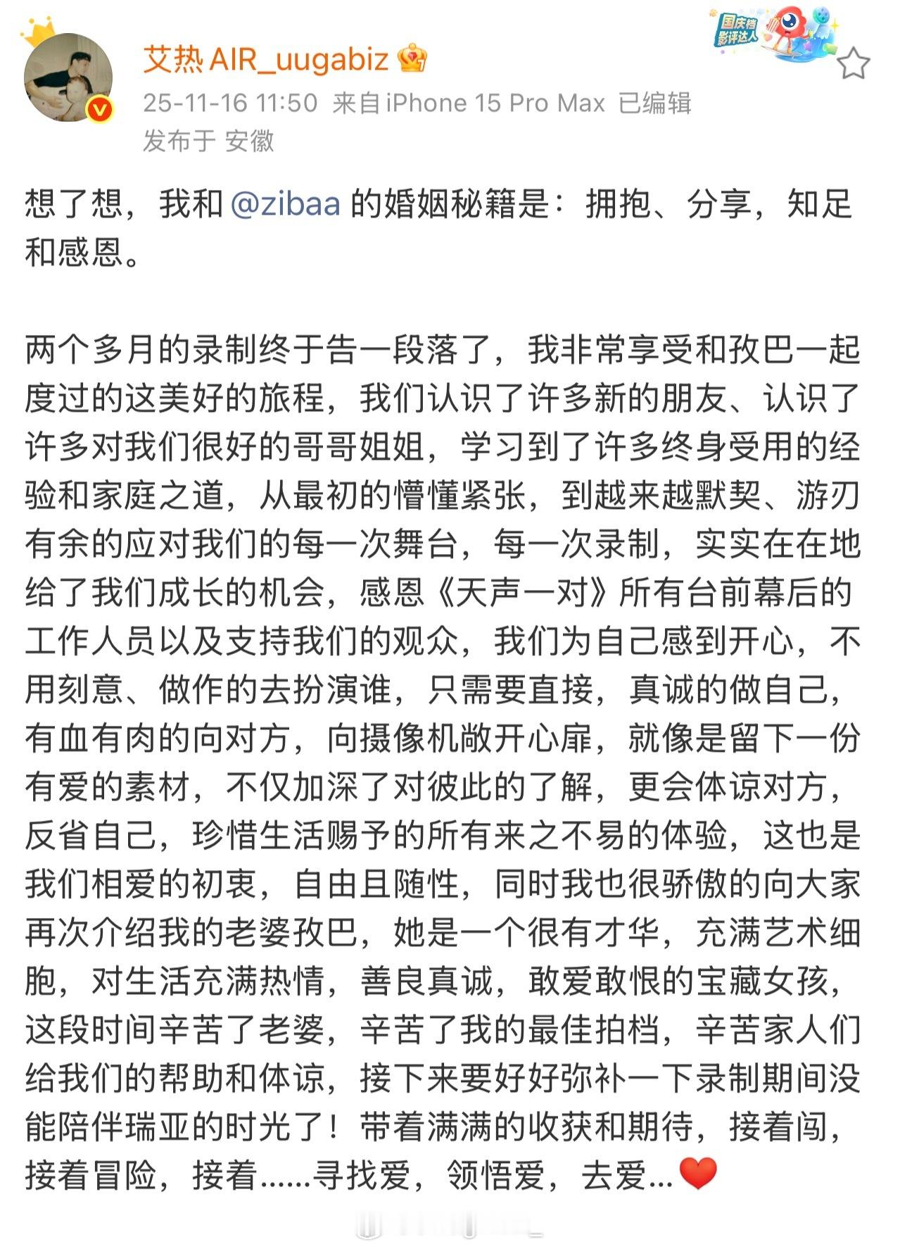 太甜了!艾热发长文谈老婆:我和孜巴的婚姻秘籍是:拥抱、分享,知足和感恩。我也很骄傲的向大家再次介绍我的老婆孜巴,她是一个很有才华,充满艺术细胞,对生活充满热情,善良真诚,敢爱敢恨的宝藏女孩!