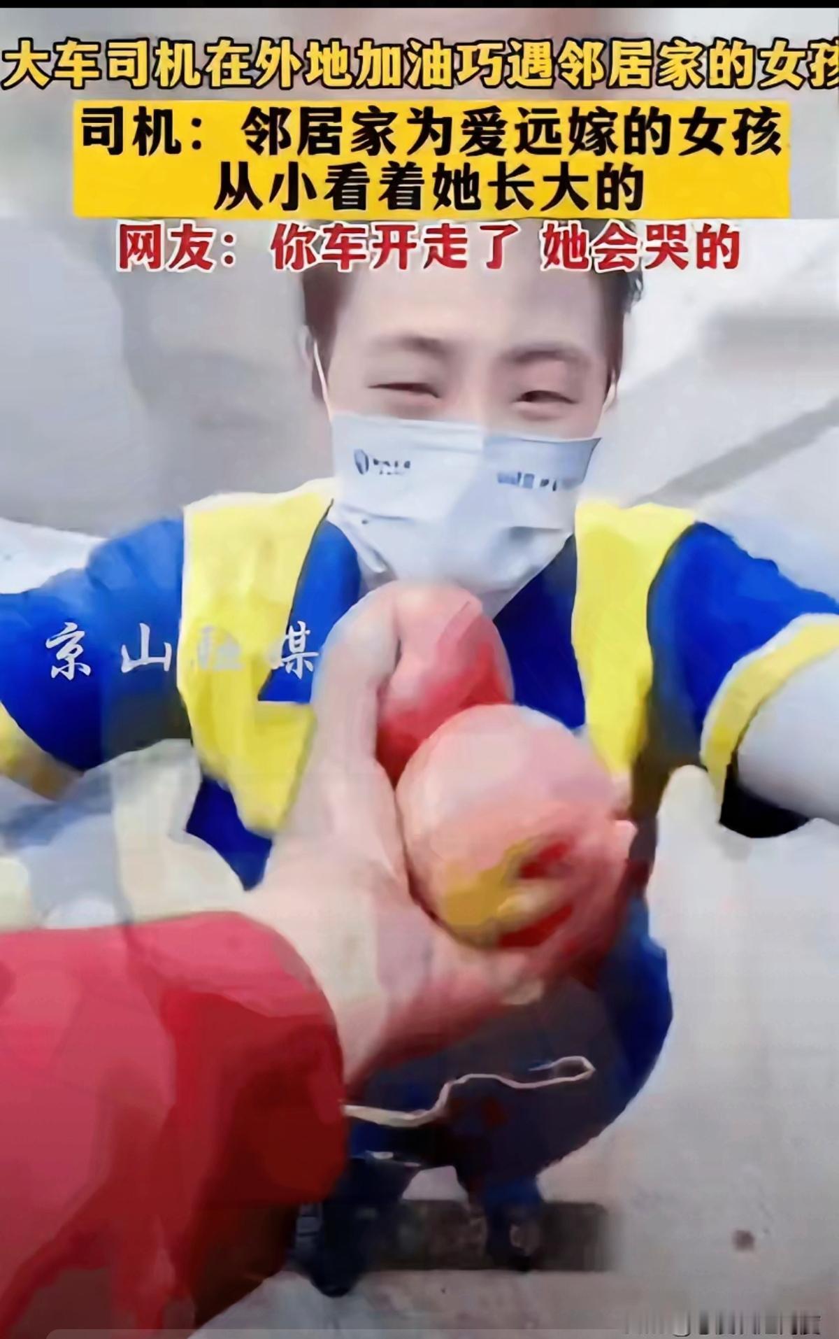 你敢信?加油站里一声乡音,竟牵出了二十多年的牵挂!河南司机黄大哥这偶遇,看得人心里又暖又酸。 戴着口罩的加油女工,一句地道河南话就让他心头一动,摘下口罩的瞬间,“娟娟”两个字一出口,时光好像都倒回了从前。远嫁湖北二十多年,从19岁的姑娘到四十多岁的妇人,她以为早已和故乡断了牵连,却在异乡被老邻居认了出来。 那两个塞过去的老家苹果,哪里是普通水果,分明是娘家人沉甸甸的惦记。他乡遇故知从来不是巧合,是刻在骨子里的乡音和牵挂,在替我们寻找着根的方向。 远嫁的人最懂这份突然的哽咽吧?你有没有在某个瞬间,突然被一句乡音、一个熟悉的身影勾起乡愁?