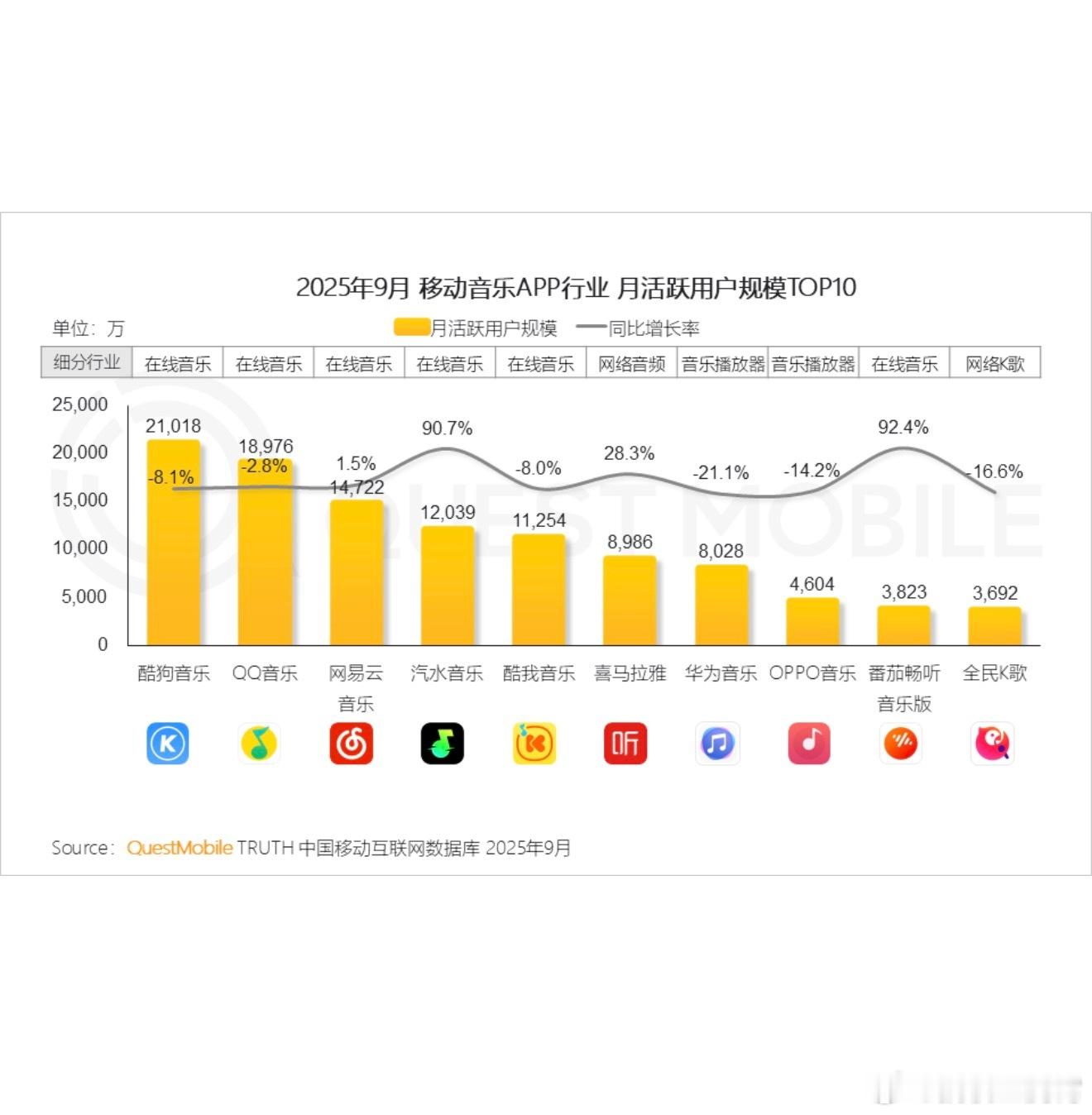 【2025年9月音乐App用户规模排名Top10出炉】①、酷狗音乐 ②、QQ音乐③、网易云音乐 ④、汽水音乐⑤、酷我音乐 ⑥、喜马拉雅⑦、华为音乐 ⑧、OPPO音乐⑨、番茄畅听 ⑩、全民K歌还真没想到酷狗音乐用的人竟然最多,话说你们平时听歌最喜欢用哪个App?