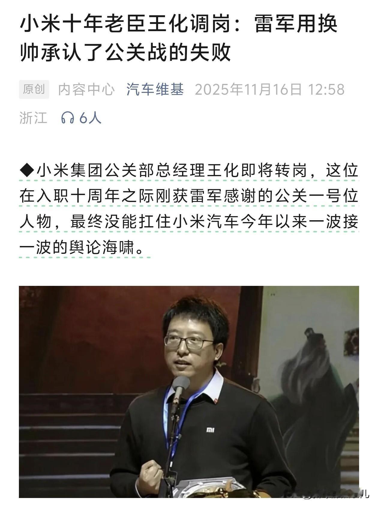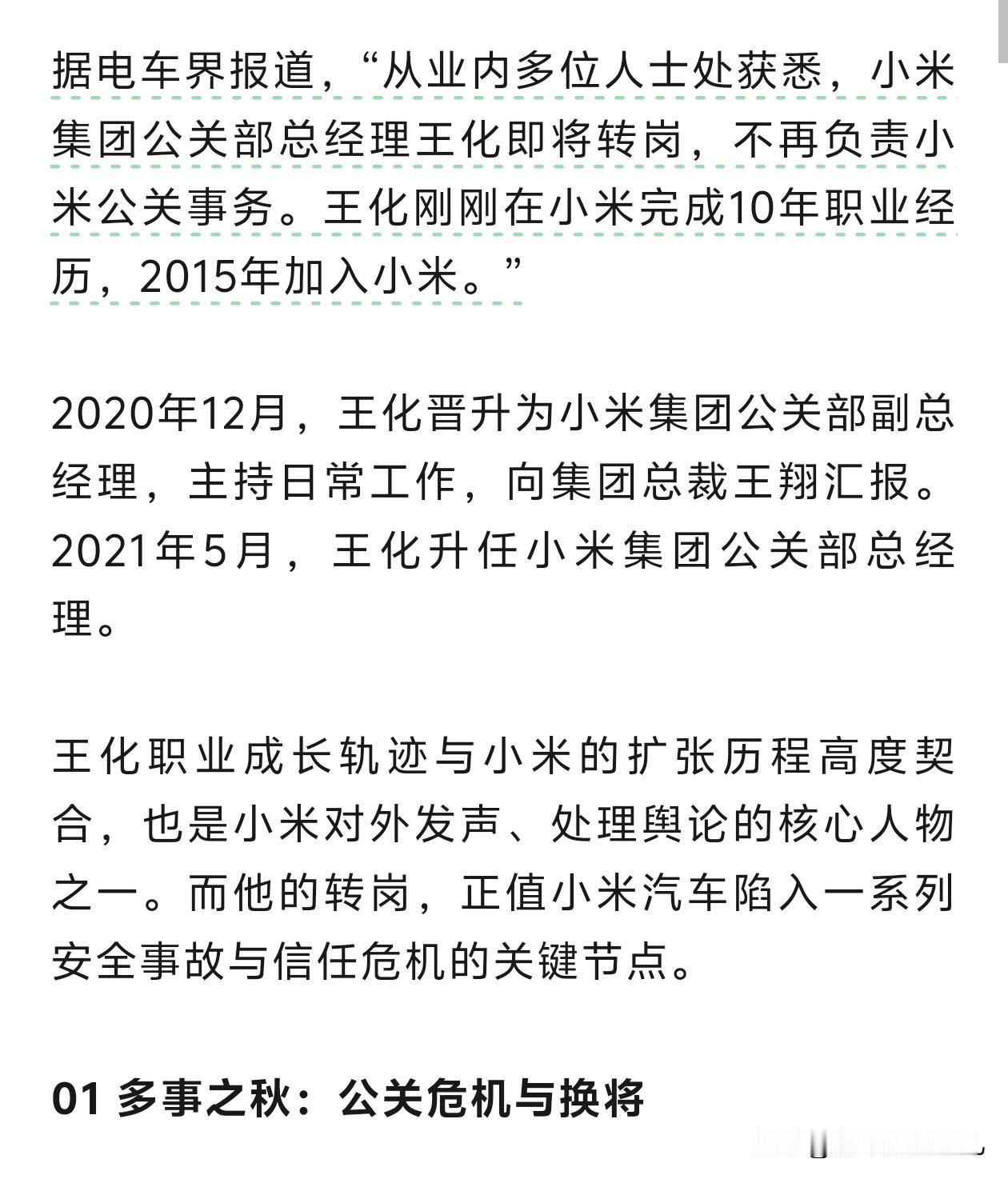 小米怎么了,王腾走了,王化也要转岗! 按照汽车维基的说法,内部转岗是因为没有扛住这次小米的舆论危机。 暂时还没有确定消息是否为真,王化昨天还在正常更新社交媒体… 雷军今天还在解释汽车安全问题。