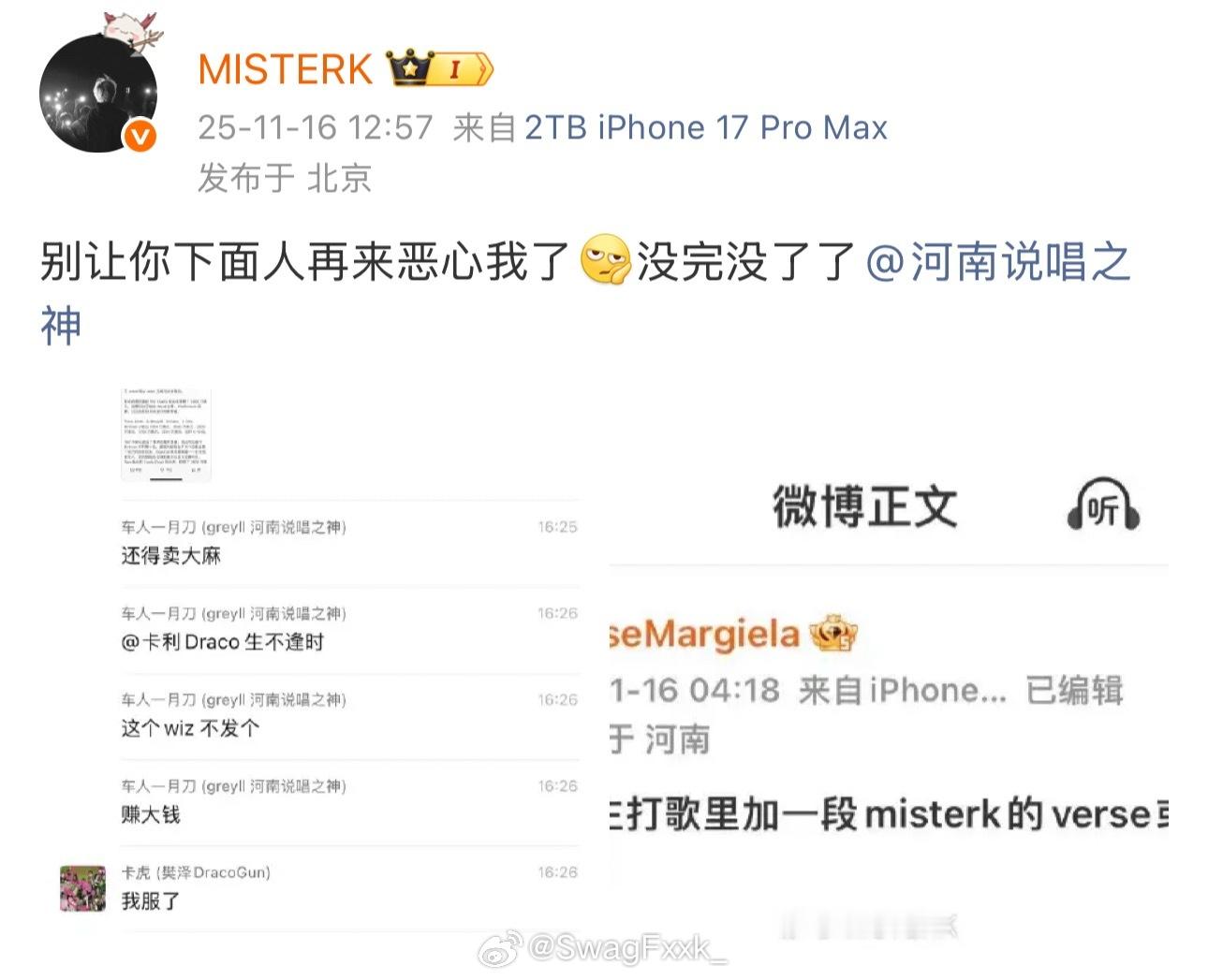 什么情况?河南说唱之神曾经的队友MISTERK晒出河南神聊天记录,开怼:别让你下面人再来恶心我了没完没了了
