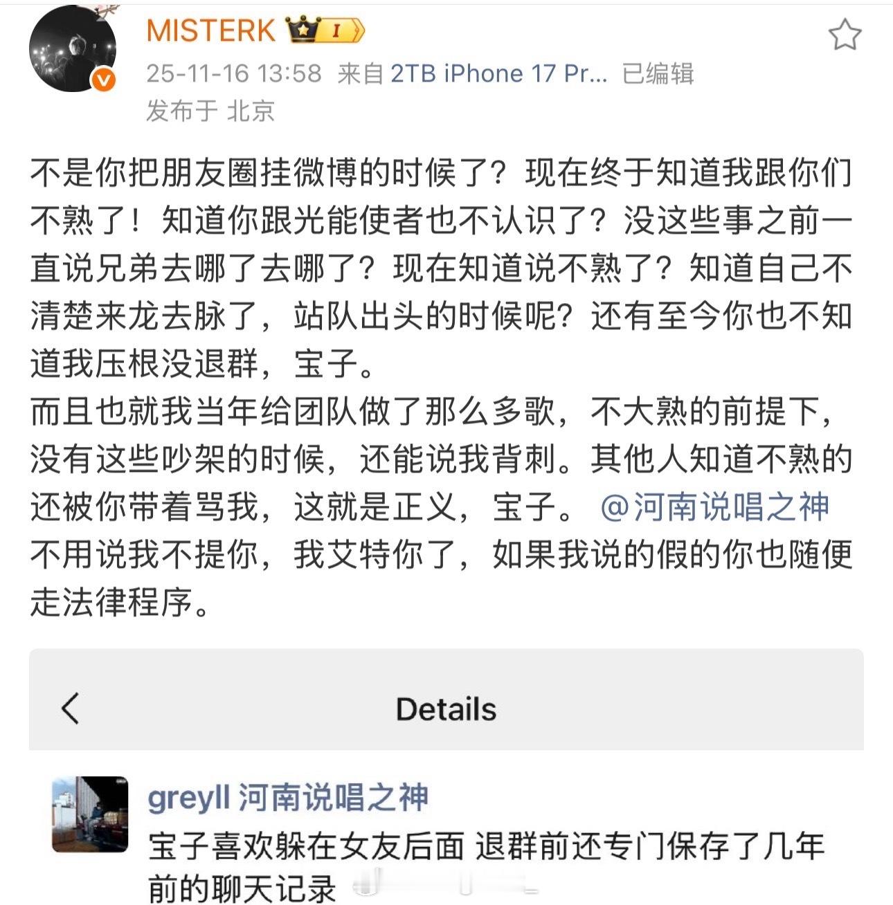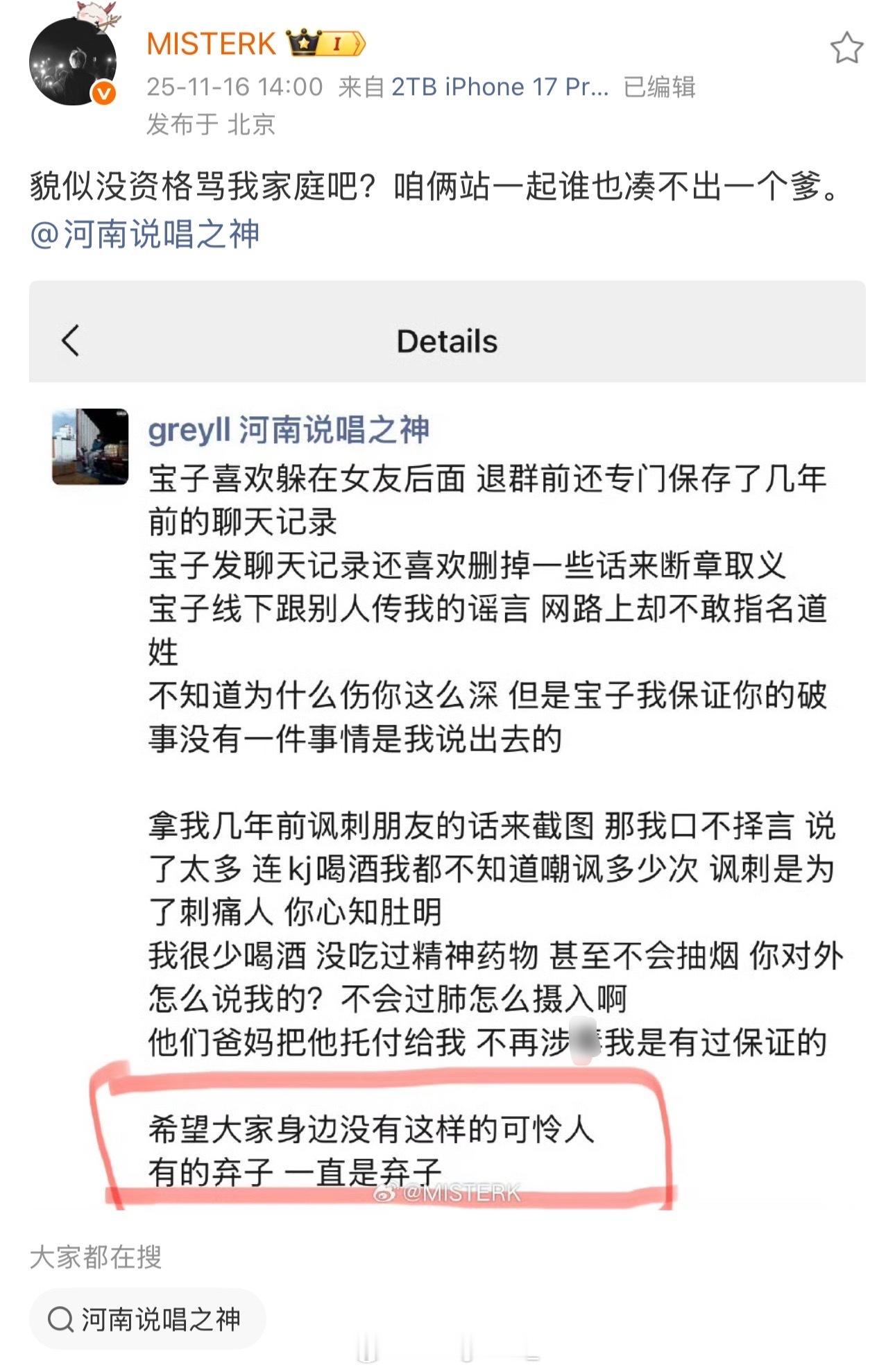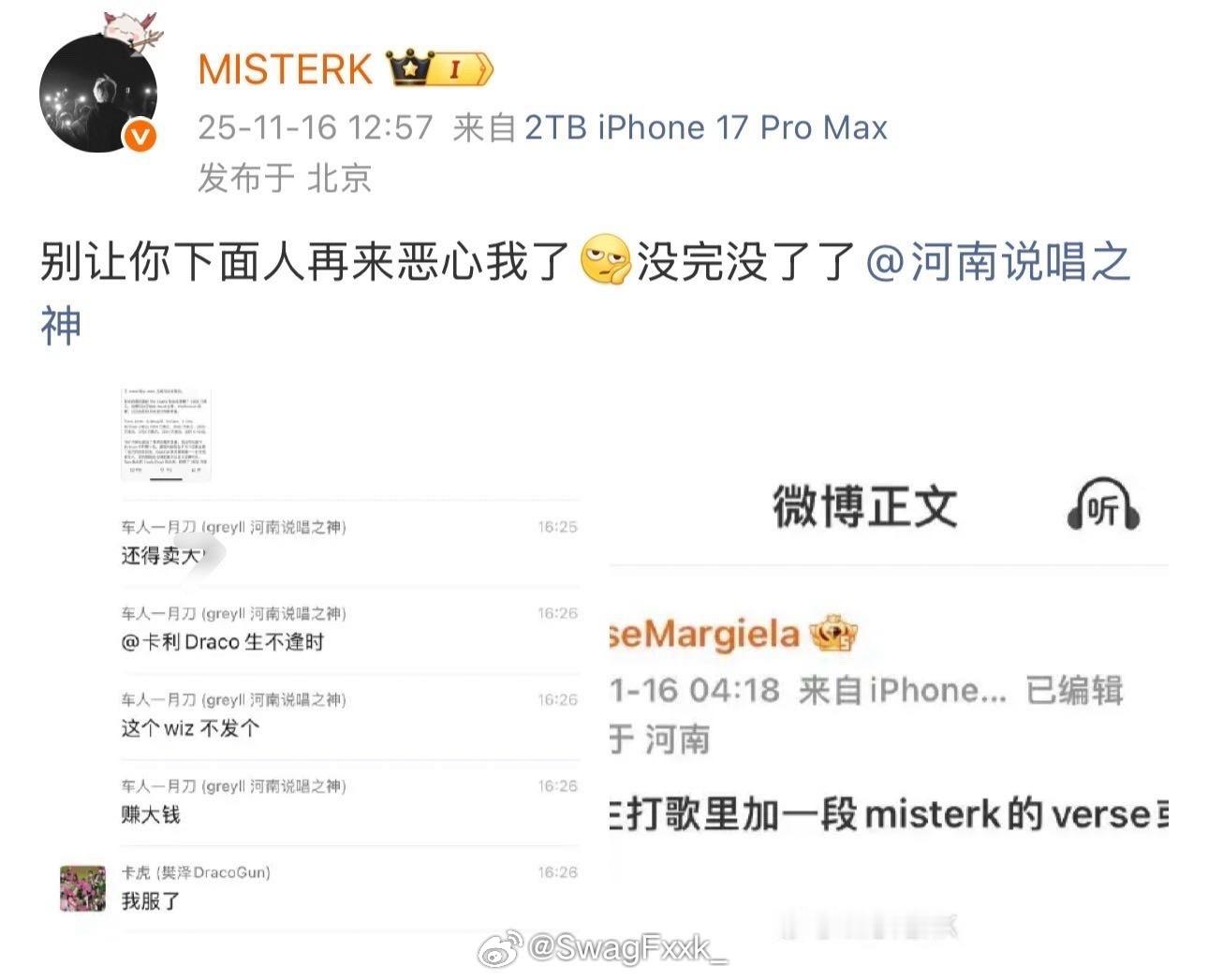 河南说唱之神曾经的队友MISTERK,开怼河南说唱之神后,河南神回应:你的破事没有一件是我说出去的,有的弃子一直是弃子。MISTERK挂出河南神朋友圈开怼:貌似没资格骂我家庭吧,咱俩站一起谁也凑不出一个爹。