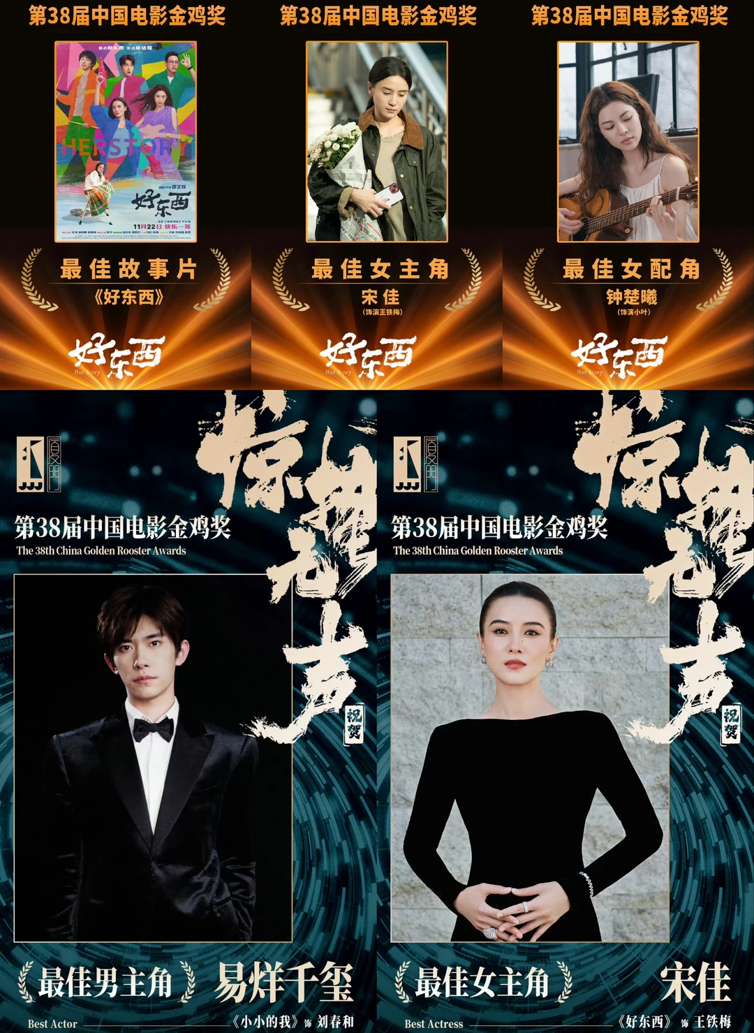 恭喜电影《好东西》喜提最佳故事片、最佳女主角宋佳 、最佳女配角钟楚曦 三项重量级奖项🎉 恭喜电影《惊蛰无声》继张译雷佳音 后迎来第三位中国电影金鸡奖最佳男主角易烊千玺 🎉 第38届中国电影金鸡奖电影好东西电影小小的我电影惊蛰无声超级肥安