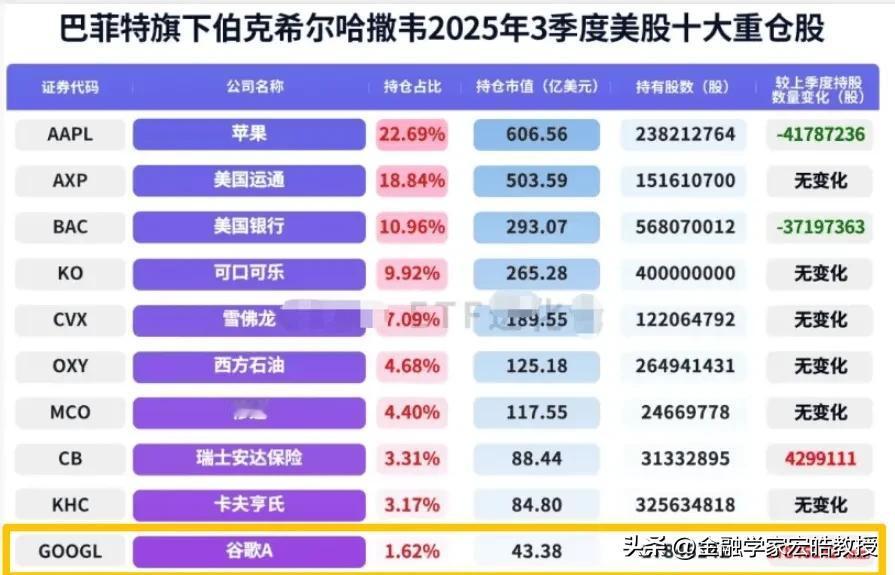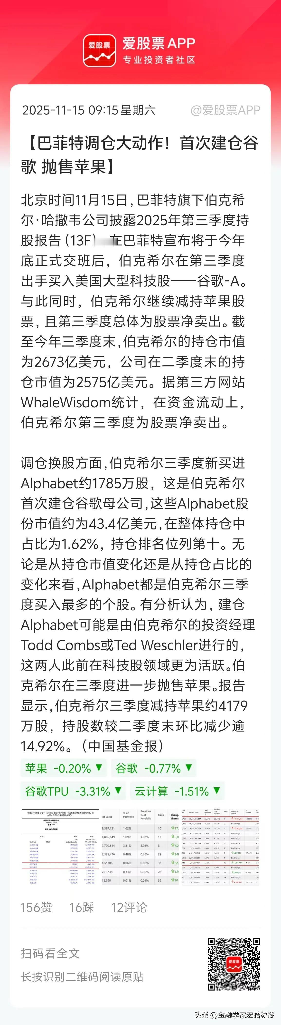 巴菲特公司也开始拥抱AI了?第三季度,伯克希尔开始减持苹果,建仓谷歌A,看起来有点后知后觉地像散户一样去追高,但是巴菲特公司一直都是这样买”确定性”。 巴菲特一直是AI绝缘体,看不懂的股票坚决不碰。在英伟达如此火爆创下美股市值第一的时候,巴菲特公司一股都没买过英伟达,错过了赚大钱的机会,但是在谷歌创历史新高的当下选择去买,巴菲特公司肯定看到了谷歌未来巨大的潜力才会做出这个举动,说明AI泡沫只是局部,未来AI发展突破的大趋势是不可逆转的。