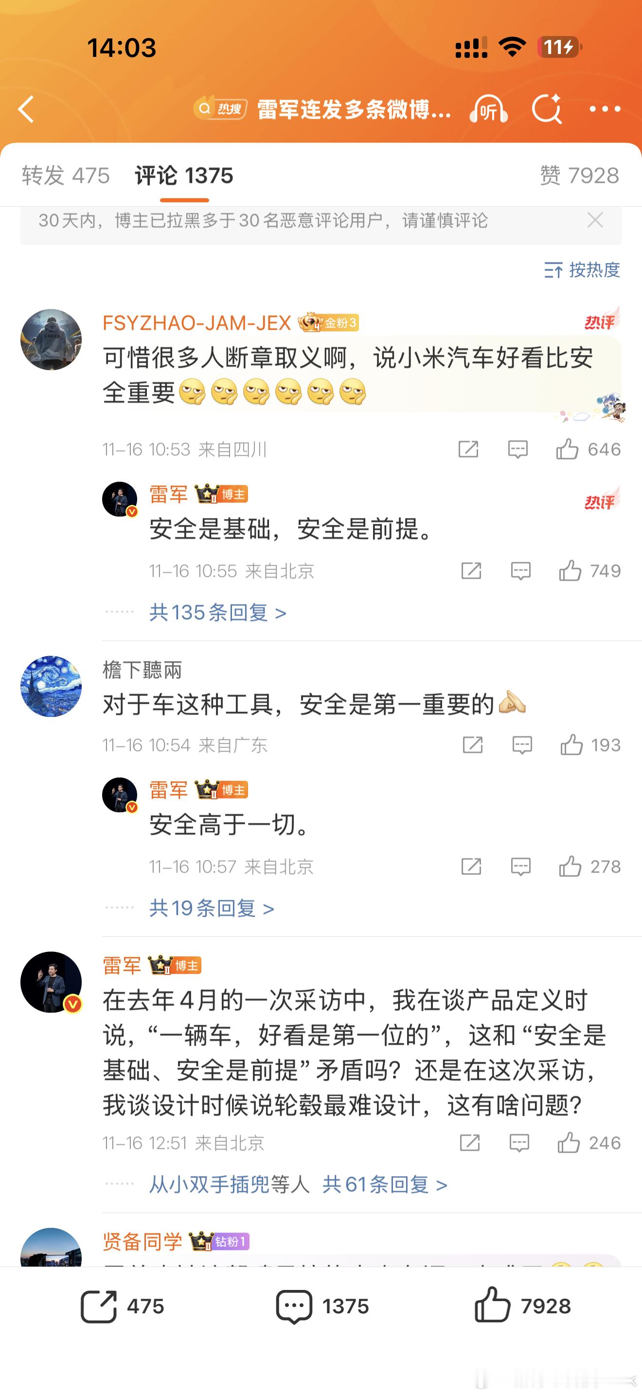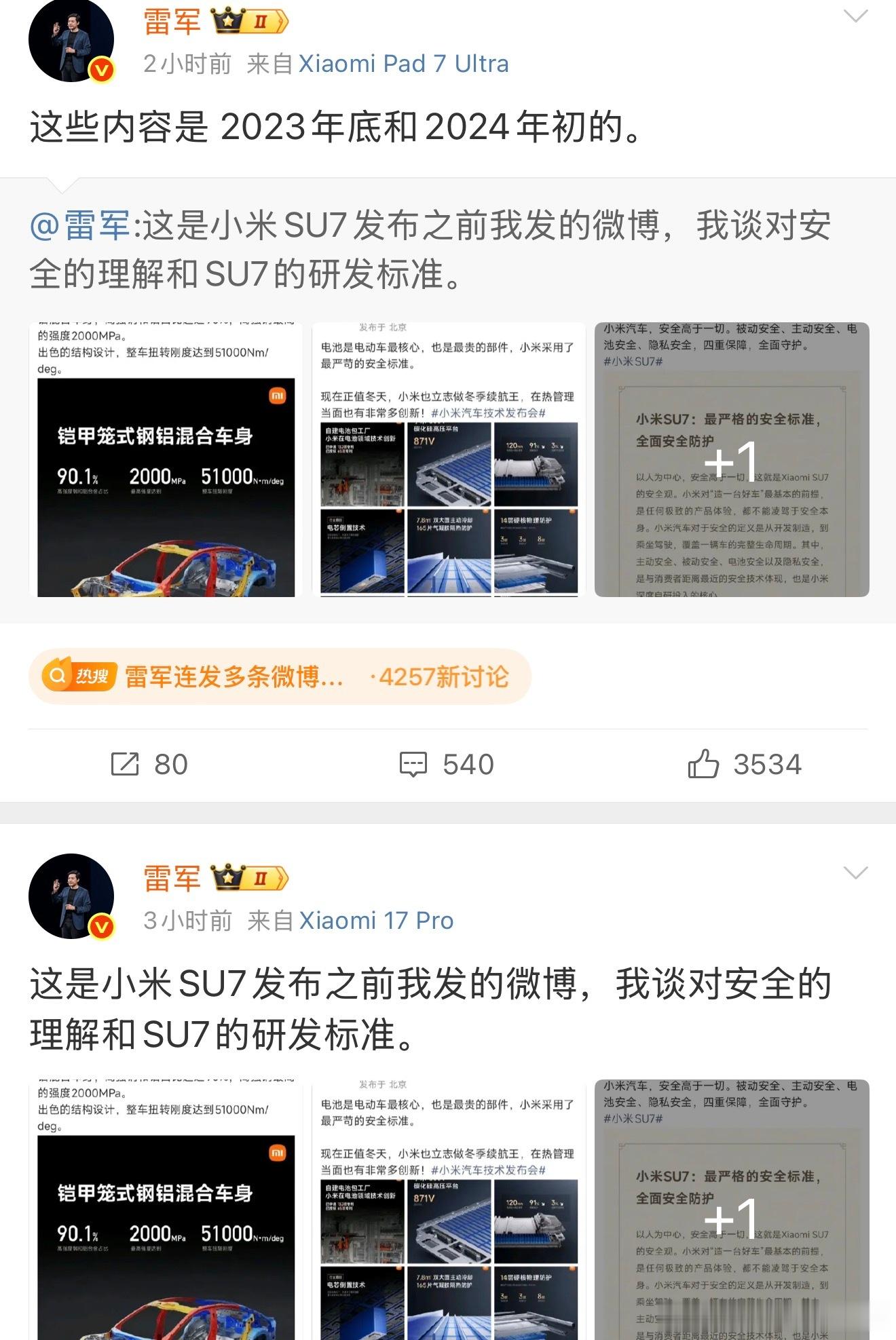 雷军从SU7发布之初就一直强调汽车安全的重要性,并且SU7一开始就是以最严苛的安全标准来进行打造。大家回想一下,去年SU7的主动和被动安全还在各种实战和中保研测试中表现出色,安全性的口碑爆棚。结果今年就被黑稿和水军断章取义,混淆视听给打成了不重视安全的标签,媒体直接无视小米汽车造车中实打实的安全设计和之前实战安全救下各种事故的记录,开始带走偏向性的引导公众,各种造谣抹黑让公众觉得小米汽车和雷军不重视安全。其实从雷军23年24年小米汽车正式发布之前的讲话和博文就能看出,小米汽车对安全这件事是真的重视,大家真的要有自己独立思考明辨是非的能力。