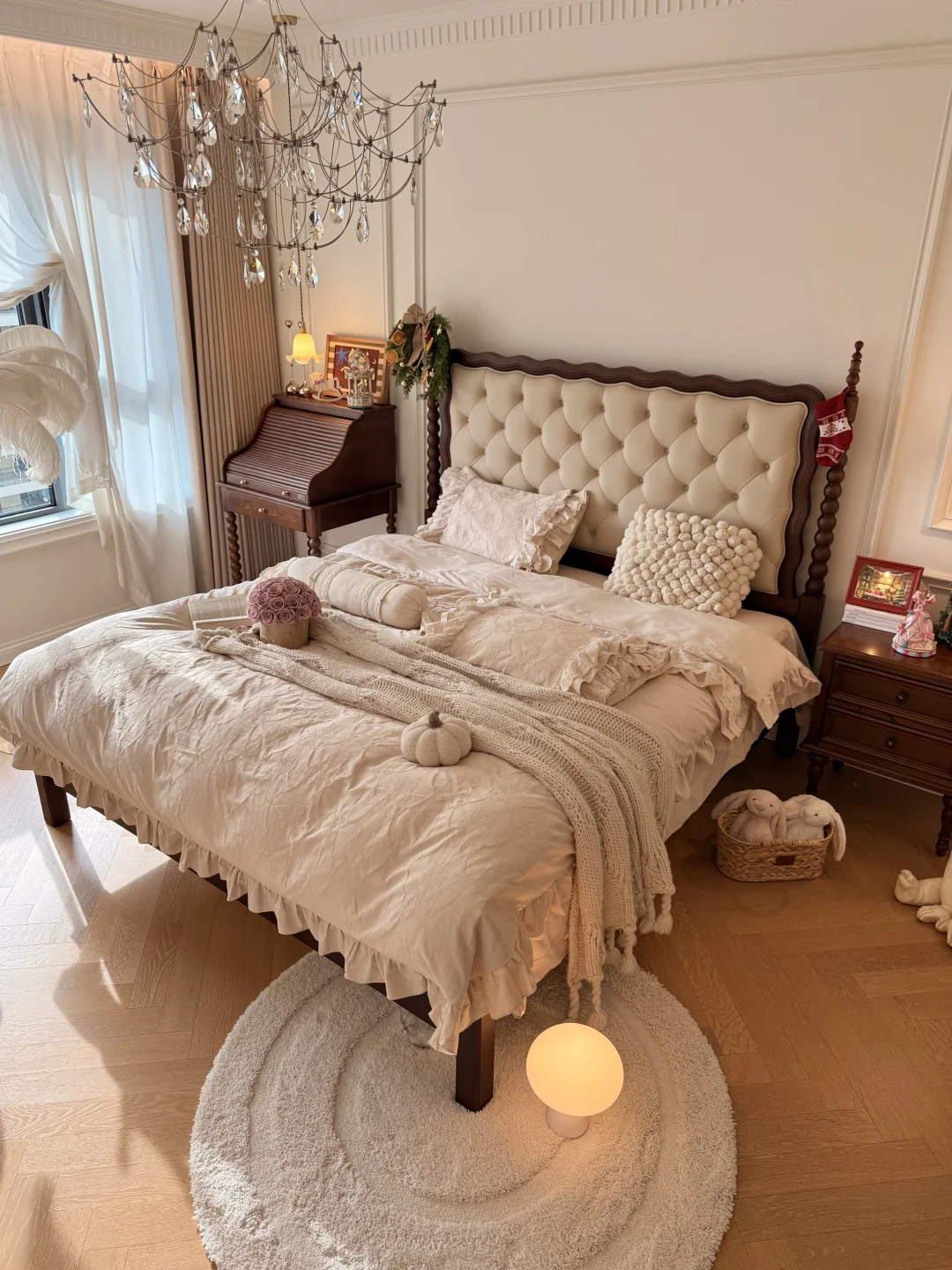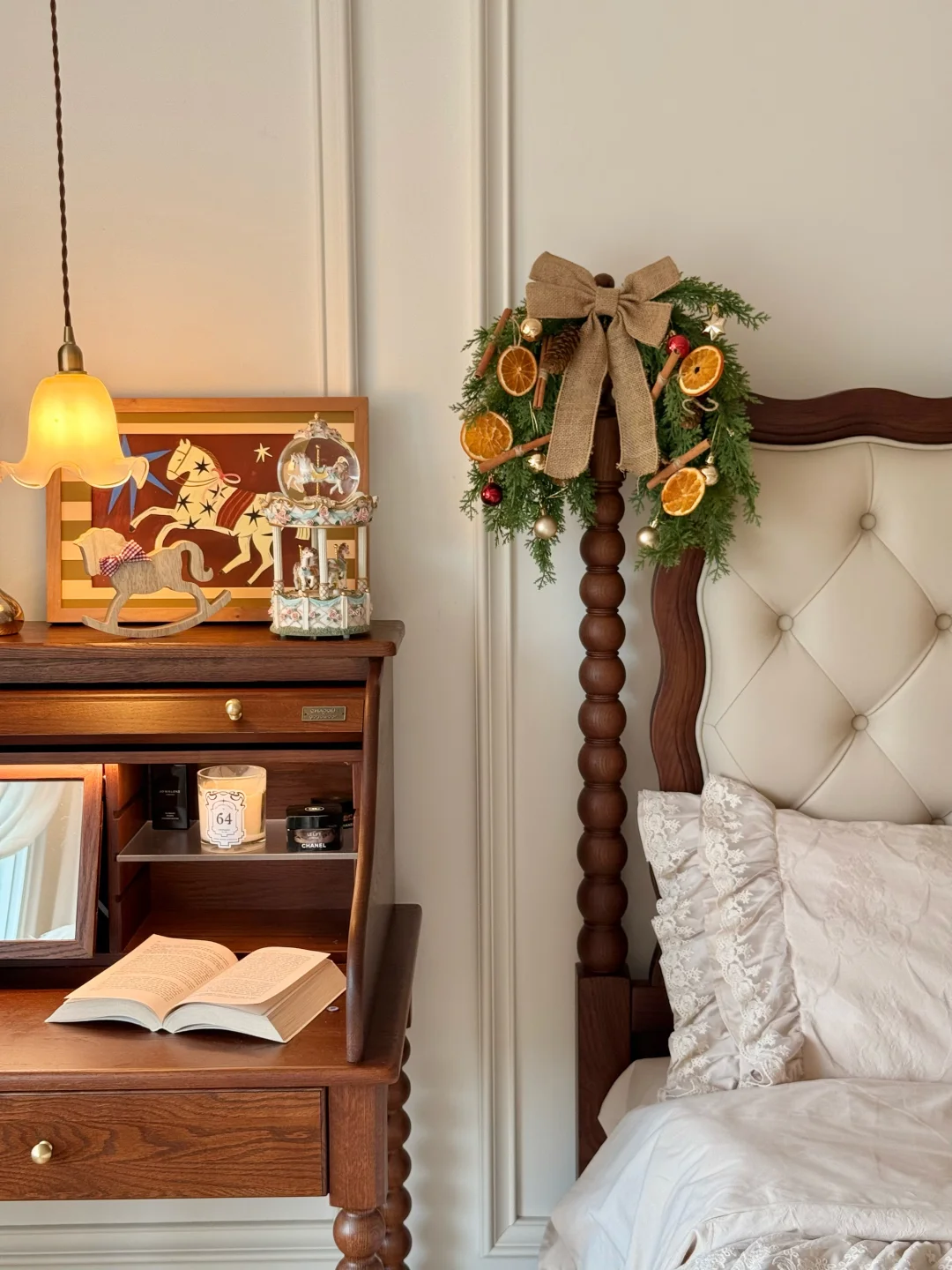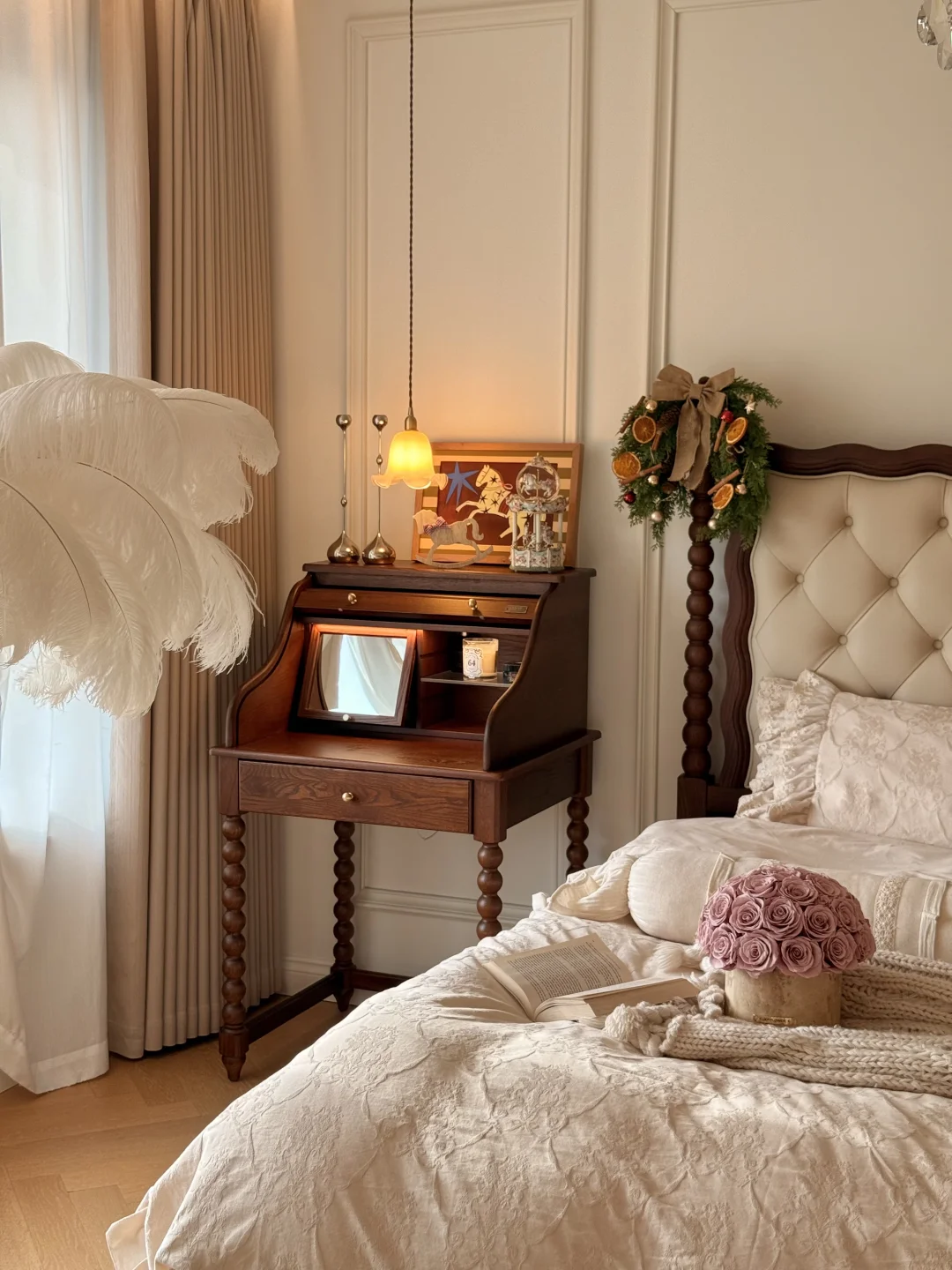 暖冬宅家记🎀 藏在法式窗棂里的圣诞氛围🌲 新换的四件套很舒服,亲肤的面料,裹着阳光晒过的柔软,像给睡眠裹了层云朵⛅️ 很喜欢胡桃木色系的家具,夏克床和风琴梳妆台很有美式高级感~ 黄洞石永生花和我的家也超配的,摆在那里都好看 不必奔赴热闹,宅家的时光才最珍贵。把法式浪漫揉进日常,这便是圣诞最好的礼物⭐️ -