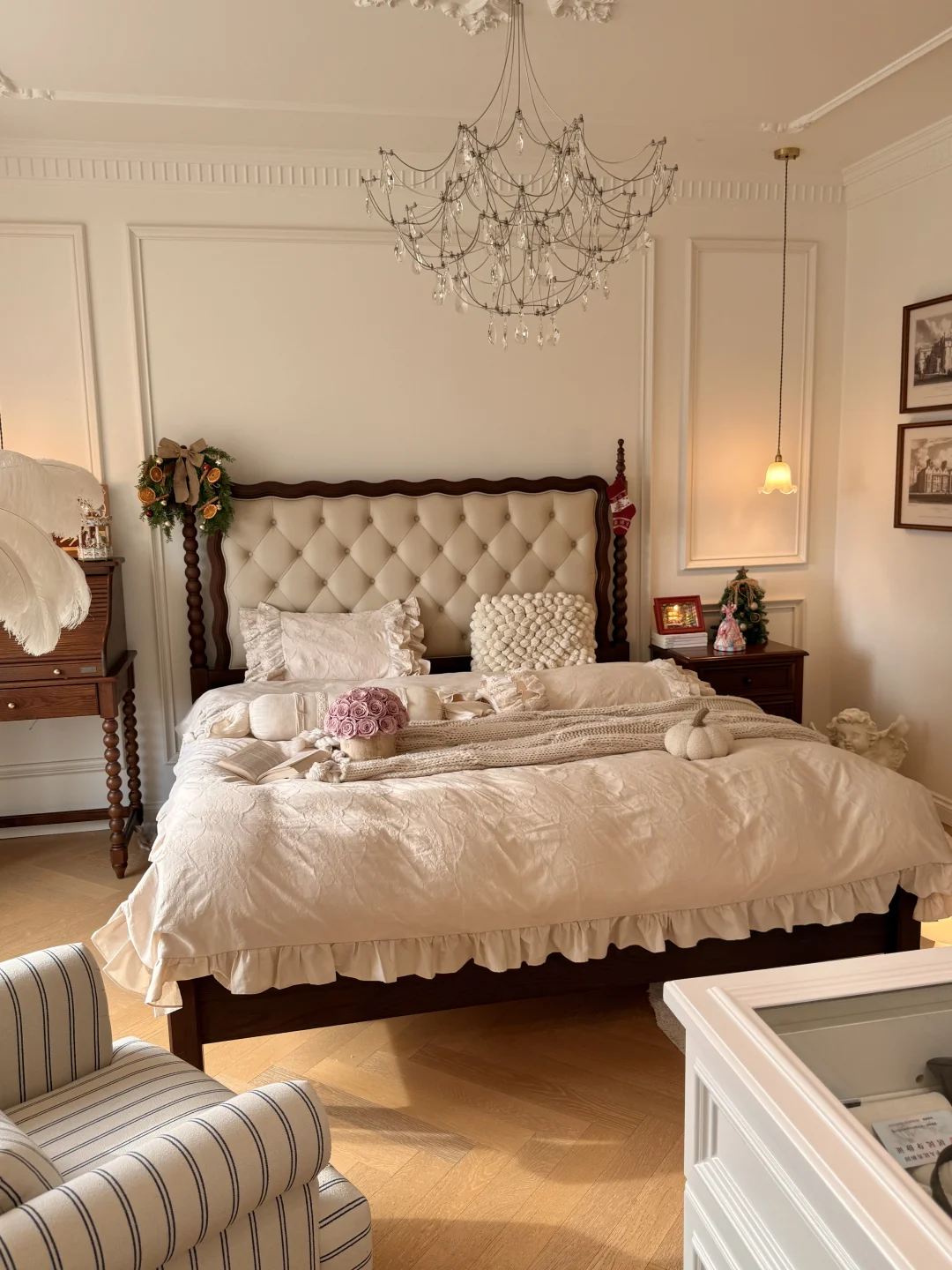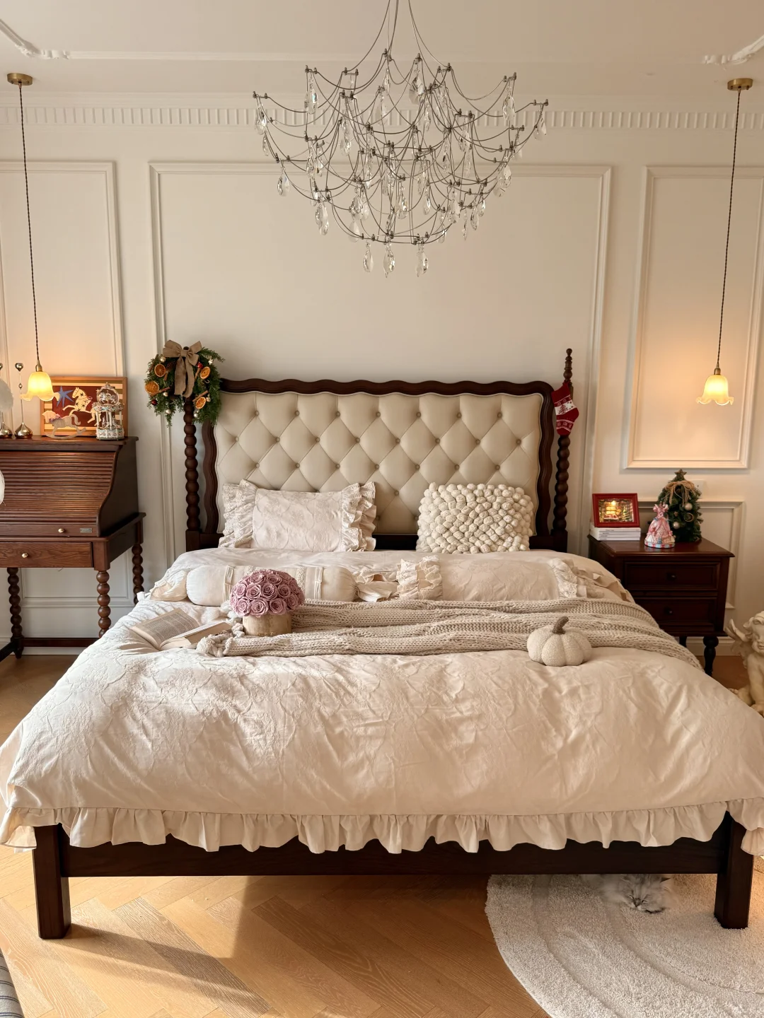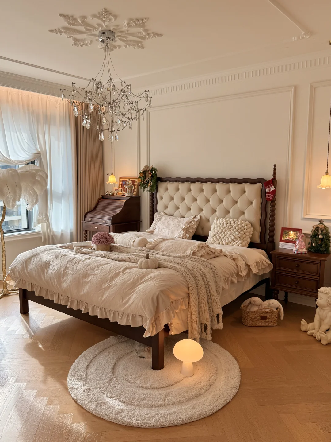 暖冬宅家记🎀 藏在法式窗棂里的圣诞氛围🌲 新换的四件套很舒服,亲肤的面料,裹着阳光晒过的柔软,像给睡眠裹了层云朵⛅️ 很喜欢胡桃木色系的家具,夏克床和风琴梳妆台很有美式高级感~ 黄洞石永生花和我的家也超配的,摆在那里都好看 不必奔赴热闹,宅家的时光才最珍贵。把法式浪漫揉进日常,这便是圣诞最好的礼物⭐️ -