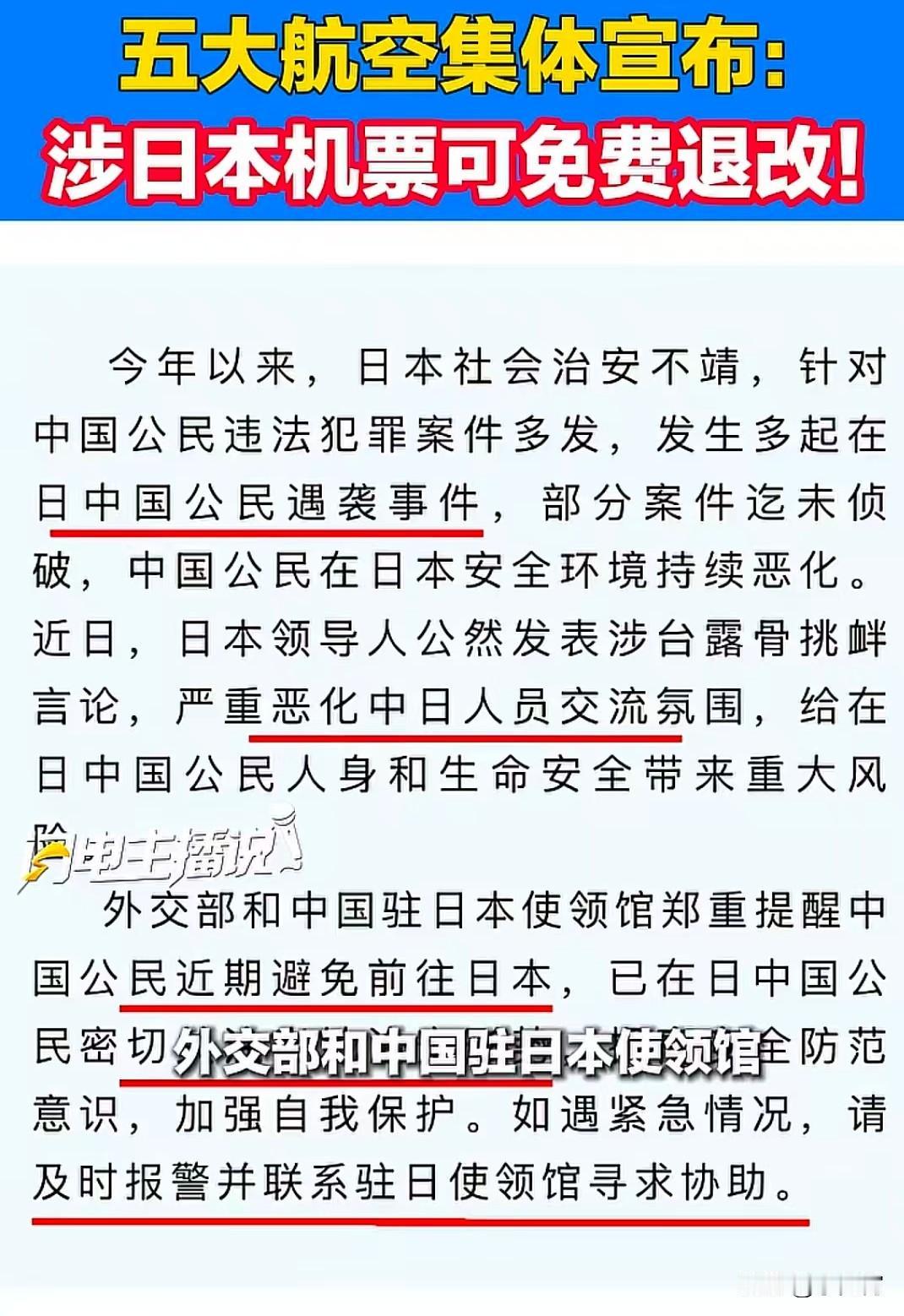刷屏了,国家一声令下,中国航司立马行动!赴日机票免费退,这速度太硬核了! 朋友圈和微博瞬间炸了!一张张退票成功的截图像雪片一样刷屏:“999开头的国航票,秒退到账!”“南航784票号,全额退款,一分没扣!”“原以为要亏几千,结果国家直接兜底!” 11月14日,外交部和中国驻日本使领馆联合发布提醒:近期日本社会治安问题突出,已发生多起中国公民遇袭事件,还涉及敏感政治言论,建议大家近期谨慎前往。 消息一出,第二天——国航、南航、东航、海航、川航、厦航、深航、春秋航空,全跟进了!集体宣布:凡是在12月31日前出行的赴日机票,符合条件的,一律免费退改!不收手续费! 重点是:不是“研究研究”,而是火速落地!有旅客晒单,上午申请,下午退款就到账了。有人原以为要亏几千块,结果一分没扣,直接退回。朋友圈都刷屏了:“不是退钱,是安全感到账了。” 这不是简单的退票,而是国家预警、企业响应的快速联动。说明什么?关键时刻,中国航司真能站出来为国人兜底。 别再说什么“航空公司都是做生意的”,这次他们用行动证明:生意重要,但中国人的安全,更重要! 这不是抵制,是底线。国家提醒你别去有风险的地方,航司就让你退得安心。这才是实打实的“安全感”。 转发让更多人看到: 走出国门,祖国永远是你最强的后盾。