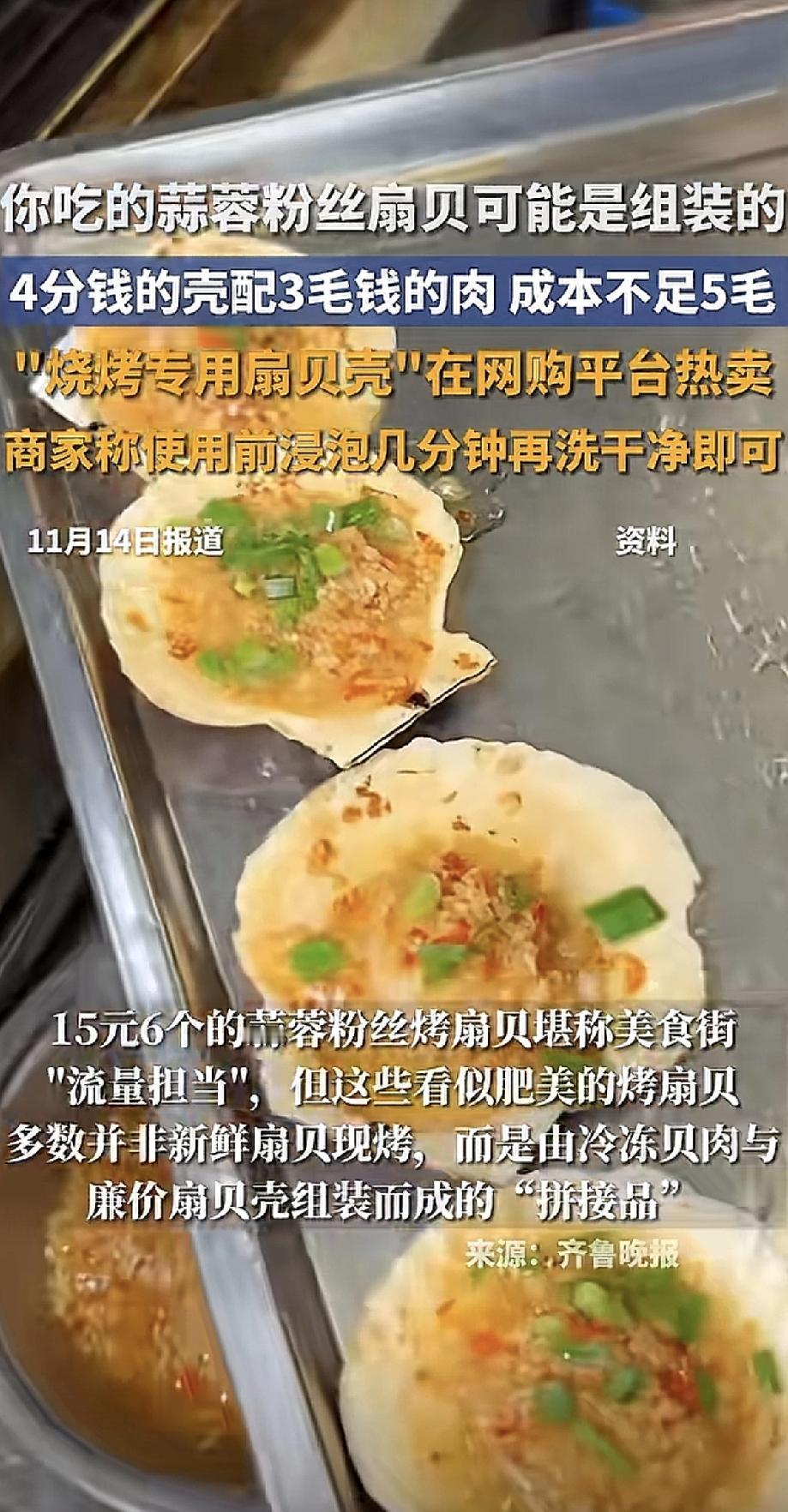 现在外面的食物都是‘科技与狠活’啊!原来烧烤摊上香喷喷的蒜蓉粉丝扇贝,很多都是“组装货”!网上专门有卖“烧烤专用扇贝壳”,4分钱一个,配上3毛钱的冷冻贝肉,成本还不到5毛。可夜市上卖15元6个,利润惊人。 商家教买家:用前泡几分钟,洗干净就行。难怪吃起来总觉得少了点鲜味。 大家吃东西还是多留个心眼,别被外表骗了。想吃真材实料,还是自己在家做最放心。