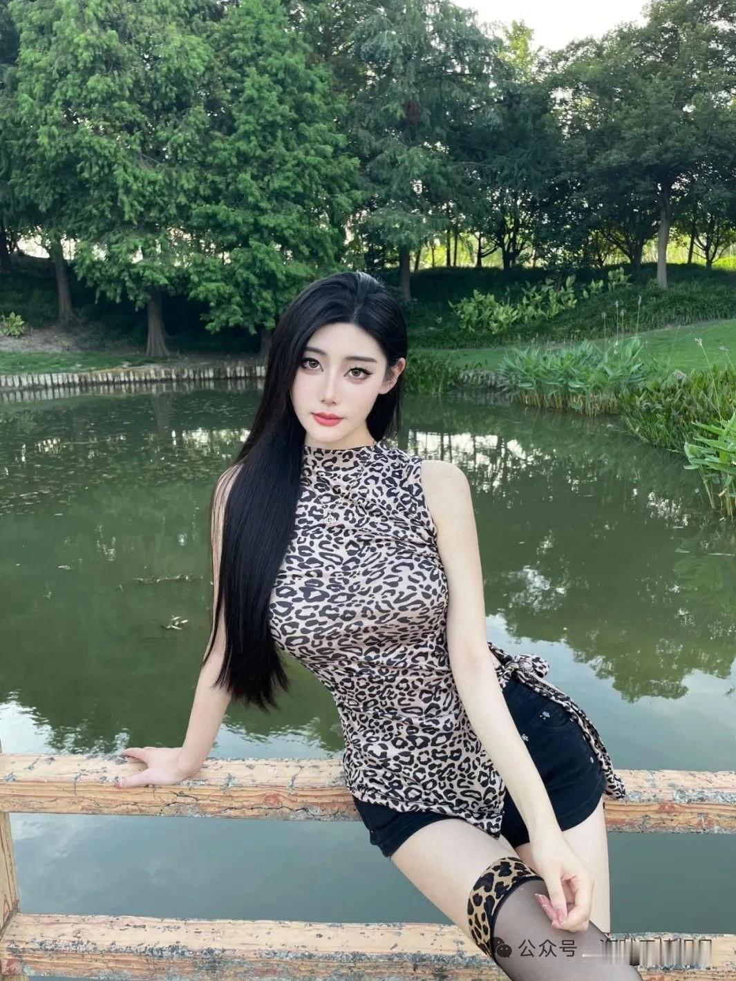 夏日公园里的时尚少女,豹纹连衣裙与高跟鞋的完美搭配,尽显优雅与自信。
