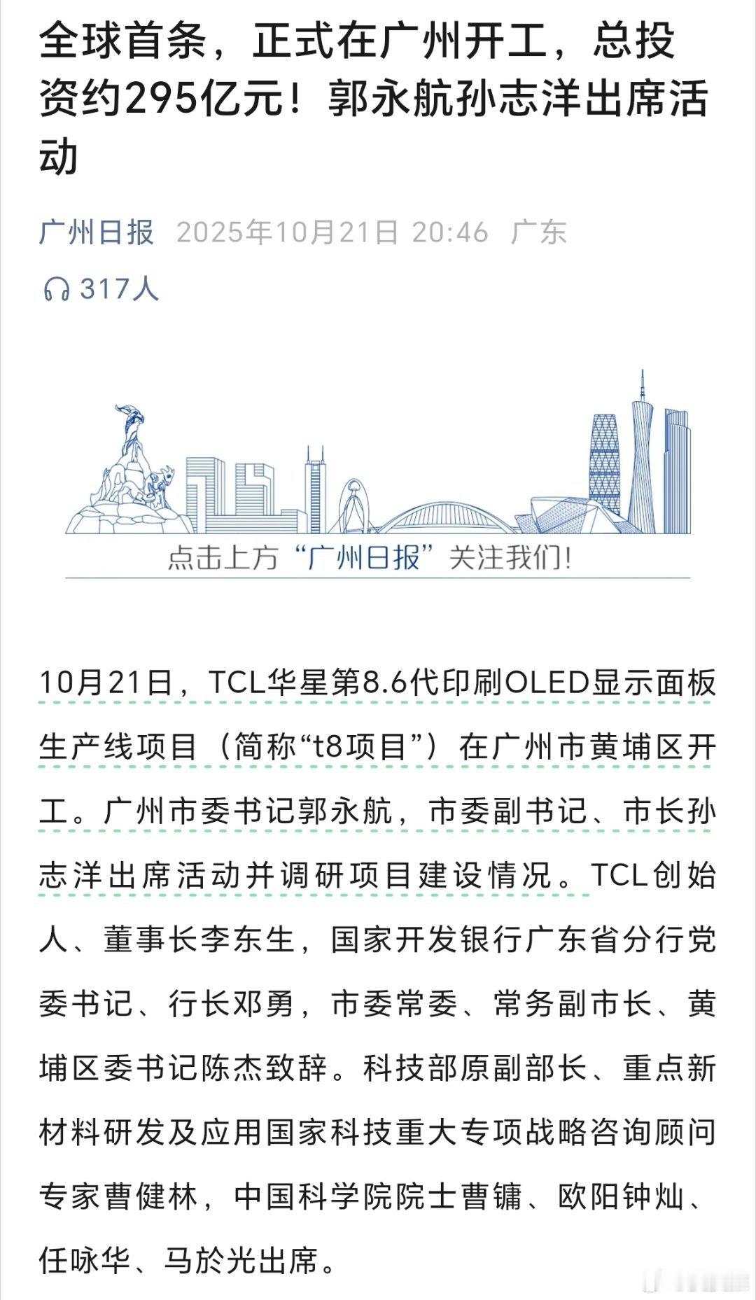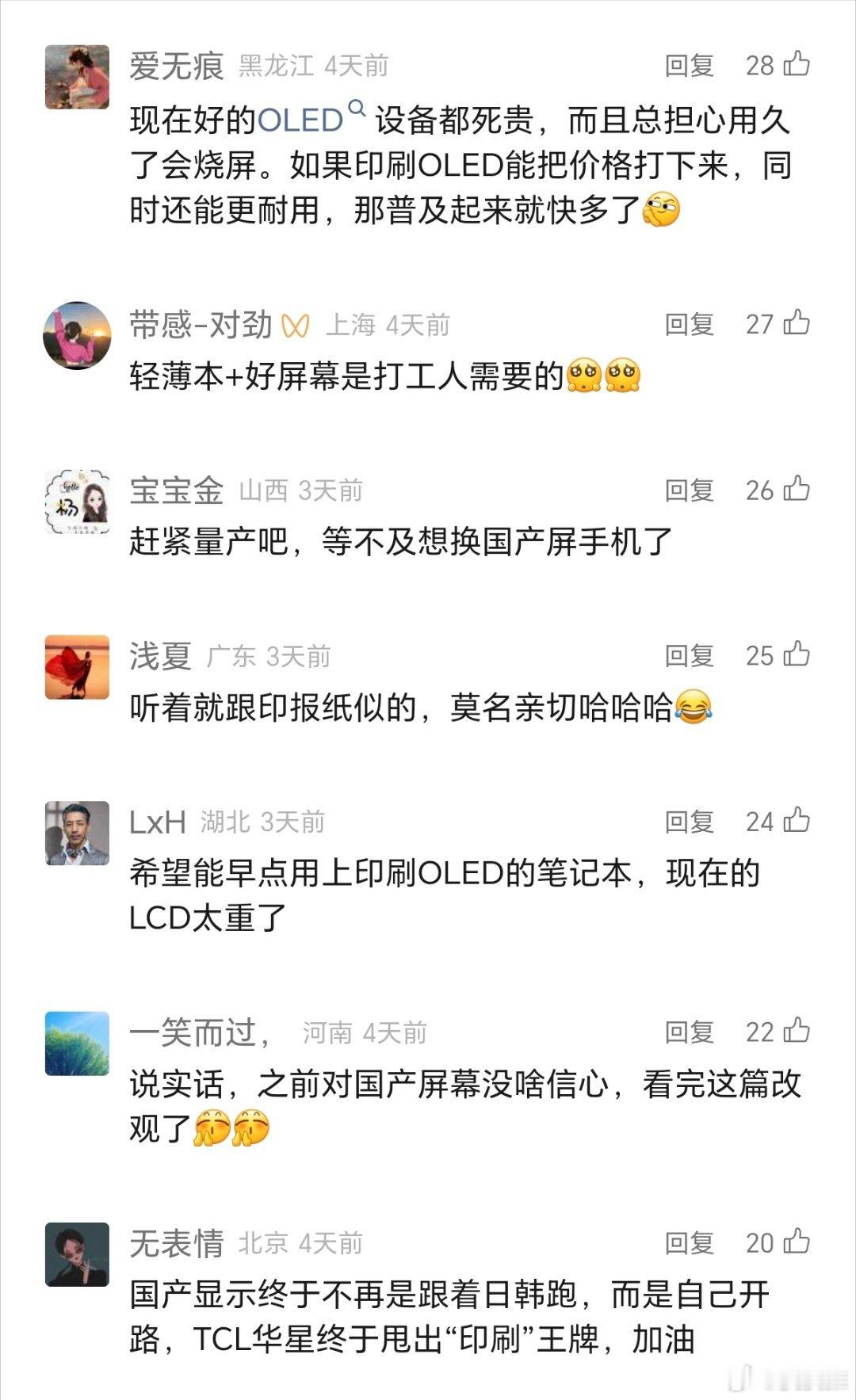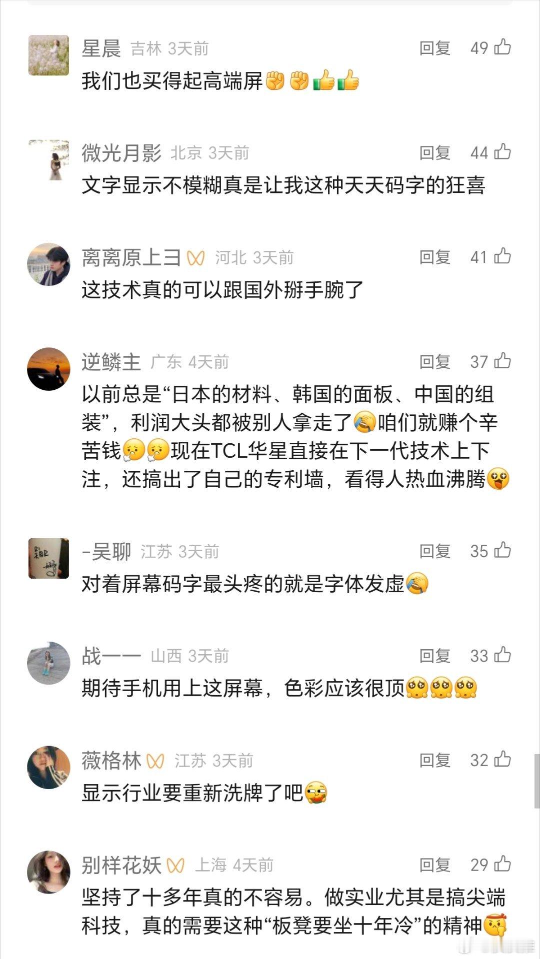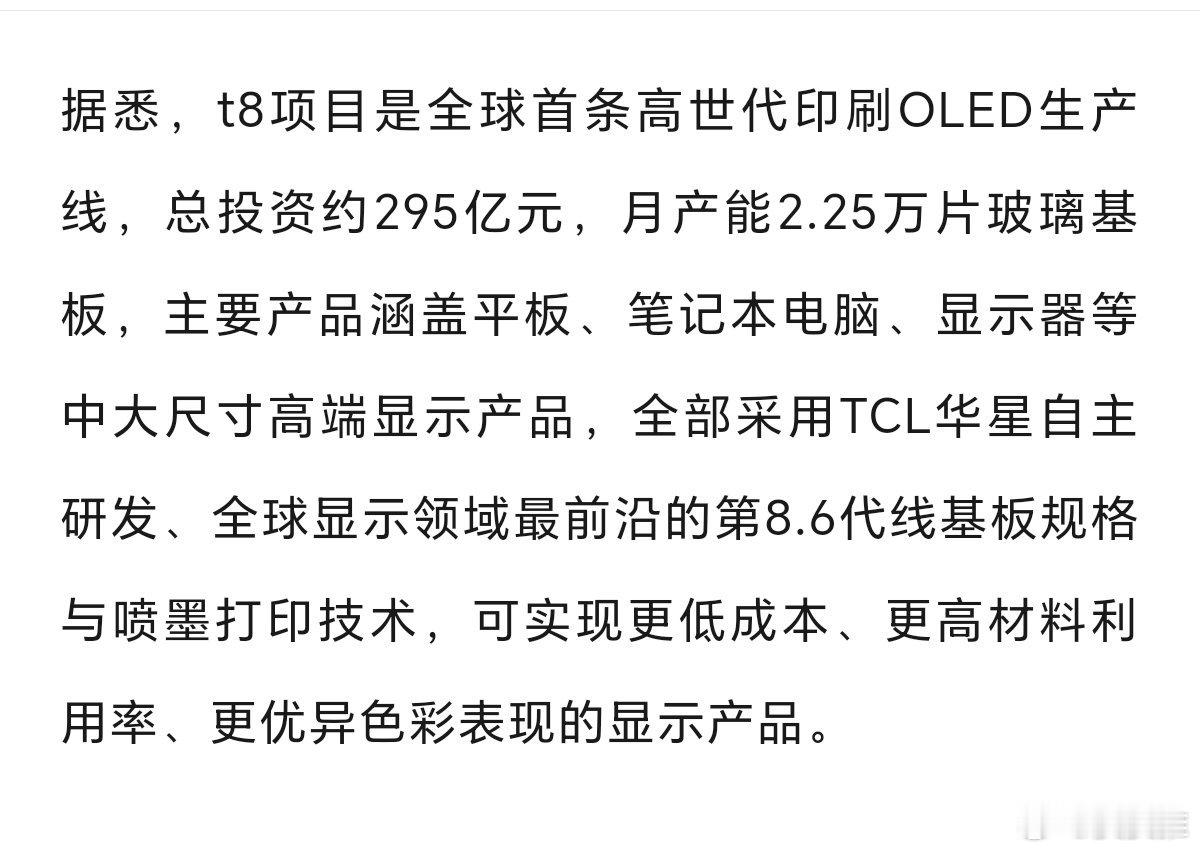 近日,在苏州召开的TCL华星全球显示生态大会上,TCL创始人李东生表示,经过12年的持续投入,TCL华星在印刷OLED领域已经取得技术领先优势。TCL期望未来能与更多合作伙伴携手,共同推动印刷OLED应用落地,引领下一代技术发展。那么,TCL华星的印刷OLED技术对于我们普通人到底有什么影响呢?据广州日报,10月21日,全球首条高世代印刷OLED生产线TCL华星t8项目在广州市黄埔区正式开工。t8项目是全球首条高世代印刷OLED生产线,总投资约295亿元,月产能2.25万片玻璃基板,主要产品涵盖平板、笔记本电脑、显示器等中大尺寸高端显示产品,全部采用TCL华星自主研发、全球显示领域最前沿的第8.6代线基板规格与喷墨打印技术,可实现更低成本、更高材料利用率、更优异色彩表现的显示产品。TCL华星印刷OLED小尺寸突破,画质更高功耗更低,这意味着你的手机屏幕画质又要飞升了!网友对此表示:以前总是“日本的材料、韩国的面板、中国的组装”,利润大头都被别人拿走了,咱们就赚个辛苦钱,现在TCL华星直接在下一代技术上下注,还搞出了自己的专利墙,看得人热血沸腾也有网友表示:现在好的OLED设备都死贵,而且总担心用久了会烧屏。如果印刷OLED能把价格打下来,同时还能更耐用,那普及起来就快多了!没想到中国在OLED领域也能实现弯道超车!