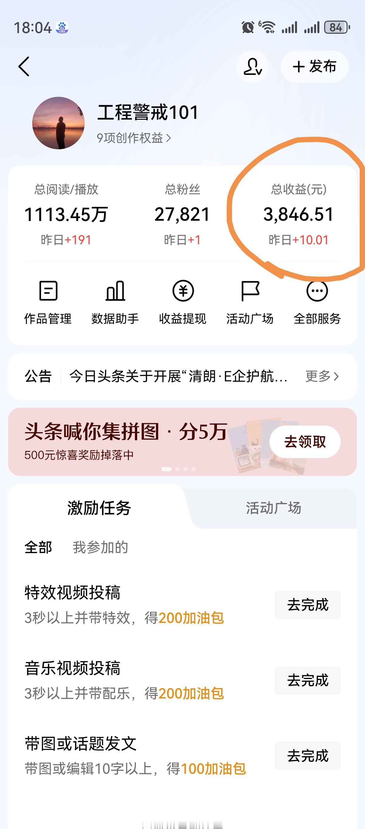 10块钱,好家伙,果然写微头条是有方法的,昨天问了一个大V博主,向他请教了在头条上赚钱的方法,果然,按照他的方法,今天就看到了结果。真的是万分感谢。 以前我流量也是挺好的,以前一天好几百都有过,可后来一点点没有流量了,收益就一点点下降了,可是我不放弃啊,不服输啊,我就不相信这个邪门,不相信救不回来,可是怎么努力都没有,流量就是很差。收益就明天几分钱好可怜。 昨天收益不多,但很开心了,希望以后越来越好,希望你们也是,流量越来越多收益越来越好。加油