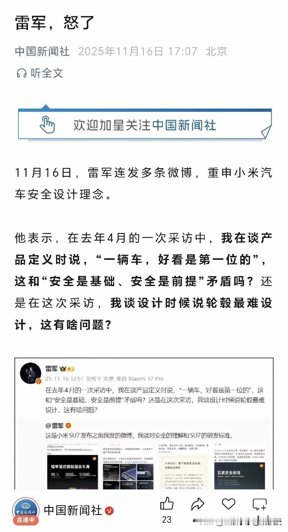刚刚看到《中国新闻社》这篇文章的标题《雷军,怒了》,仔细看了雷军发文,雷军是在澄清自己的一些观点。 雷军今天发了多条文,称自己说“好看是第一位”和“安全是基础和前提”矛盾吗?雷军此番表态,是想说明他绝不是一个颜值控,生产汽车绝不是儿戏,最重要的还是安全。这番义正言辞的澄清,是想让大家消除对雷军此前表态的误解。