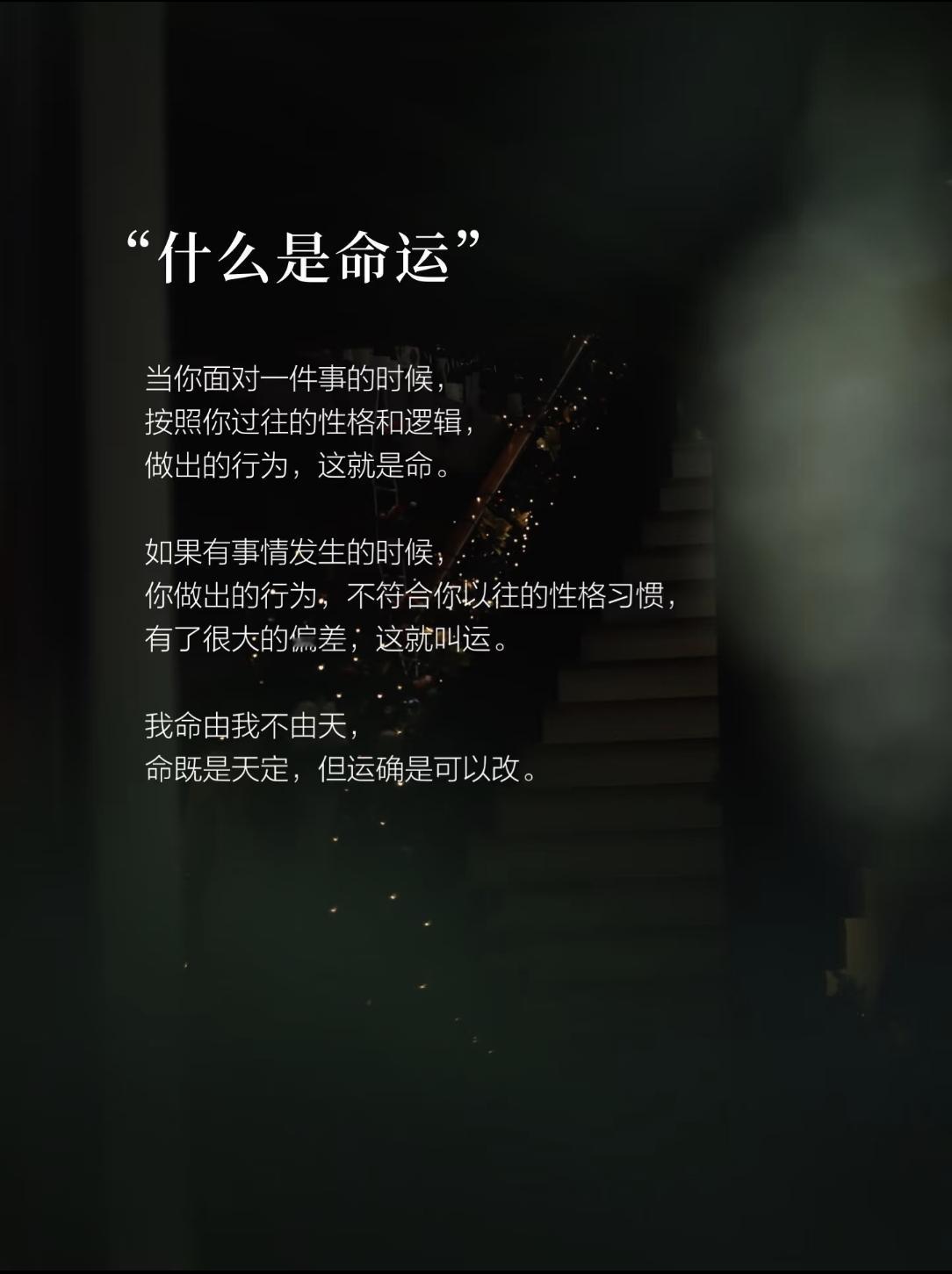 1、命运的转折往往都藏在我们的焦虑当中,焦虑会让你觉察; 释义:中医说通则不痛,痛则不通。焦虑抑郁说明你的心不顺畅了。学会自我诊断,深度剖析、了解自己,或许可以在让你难受的地方找到人生的解药。 2、命运从不奖赏那些守城的人,它只偏爱愿意更新自己的人; 释义:在这个日新月异的时代,墨守成规、固步自封就是“心甘情愿”等着被时代淘汰。而保持开放,抵抗熵增,终身学习的人就会紧跟时代潮流,甚至成为弄潮儿。 3、这个世界是有浮力的,放松的你就会被托举。 释义:一个人越放松、越专注从而越容易进入心流状态。就如乒乓球被摁入水中松开之后就会弹回水面,所以学会摆脱外力的束缚,不断地向内求,专注打磨自己就可以活在平均水平之上。 世人习惯用命运来解释人生际遇,其实三年前的你选择了什么决定你今天在哪里。 而选择的底层逻辑里有一个关键决定项就是性格。当我们回顾命运时就会体会到:命是性格的投影,运是性格的突破。 ------------------------------------ 点个赞+小评一下,愿人生的旅途从容洒脱,不慌不忙; 关注我+收藏一下,愿岁月的长河浅笑安然,细水长流。 冬日生活打卡季 11月·每日幸运签