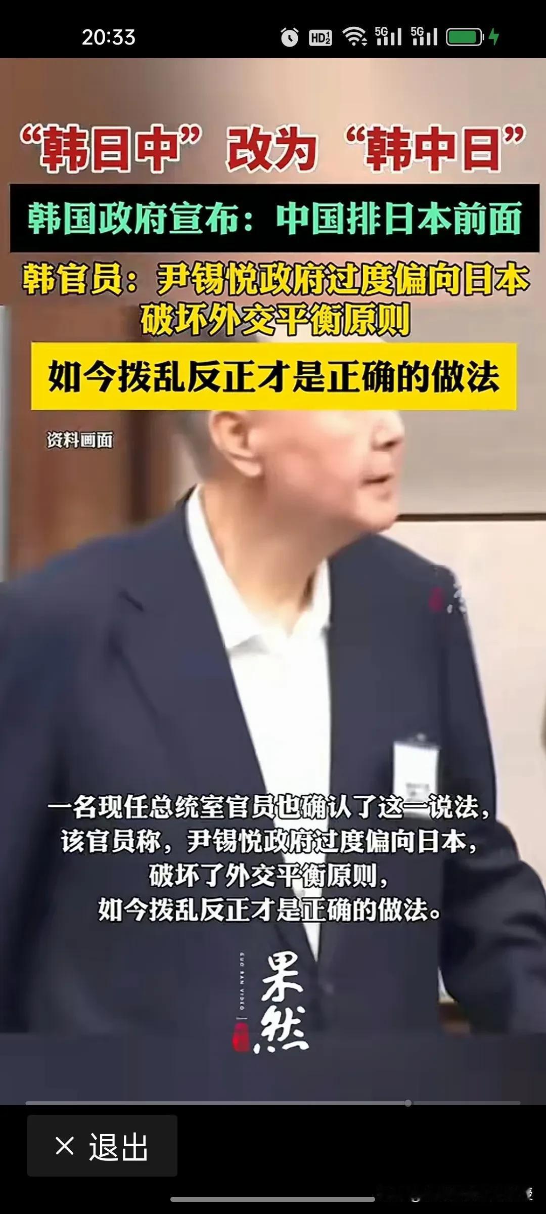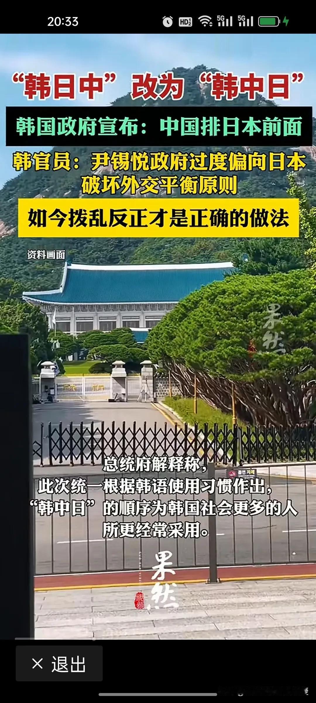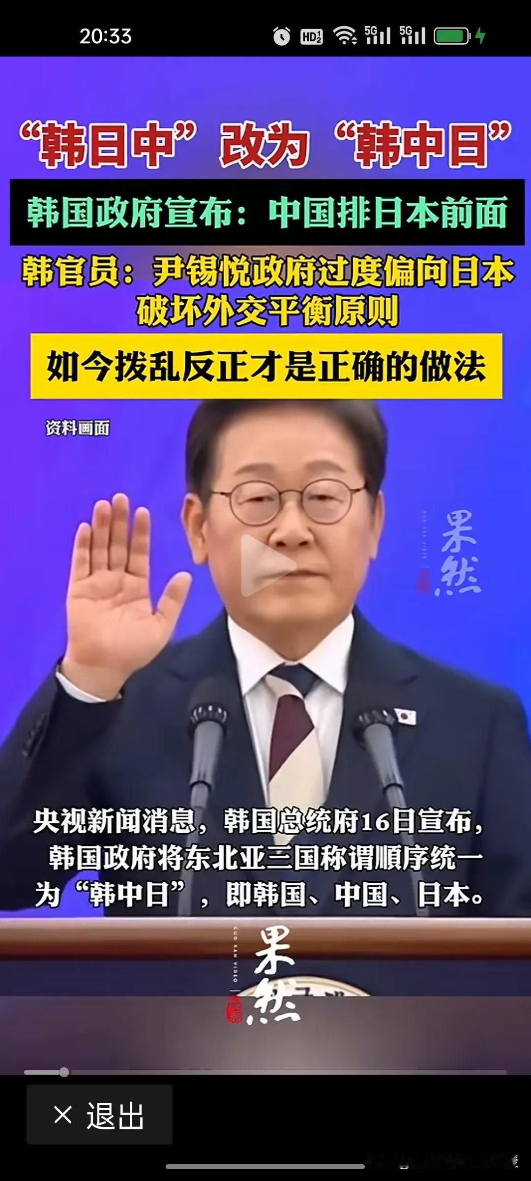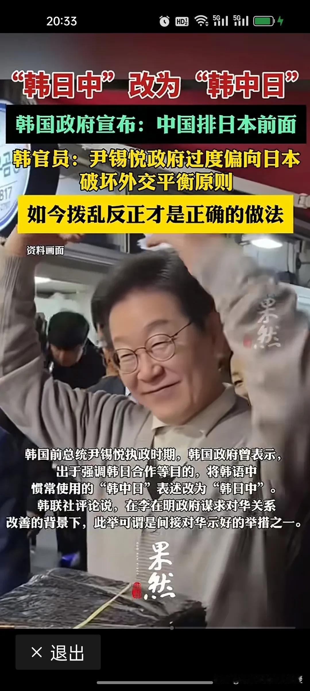 韩国总统李在明在关键节骨眼上拨乱反正了,趁着高市早苗对华出言不逊的当下,将东北亚三国称谓顺序改成“韩中日”。 韩联社说,李在明政府谋求对华关系改善,当下做了重要的国家排位改动,将中国放在日本前面,可谓是间接对华示好的措施之一。韩国官员也表示尹锡悦政府过度依赖日本,破坏了外交平衡。 不得不说,李在明还是聪明人,在日本右翼势力抬头背景之下,这步棋既顺应当地民意,又契合中韩两国合作大势,足见其外交智慧,也为中韩关系回暖埋下伏笔。