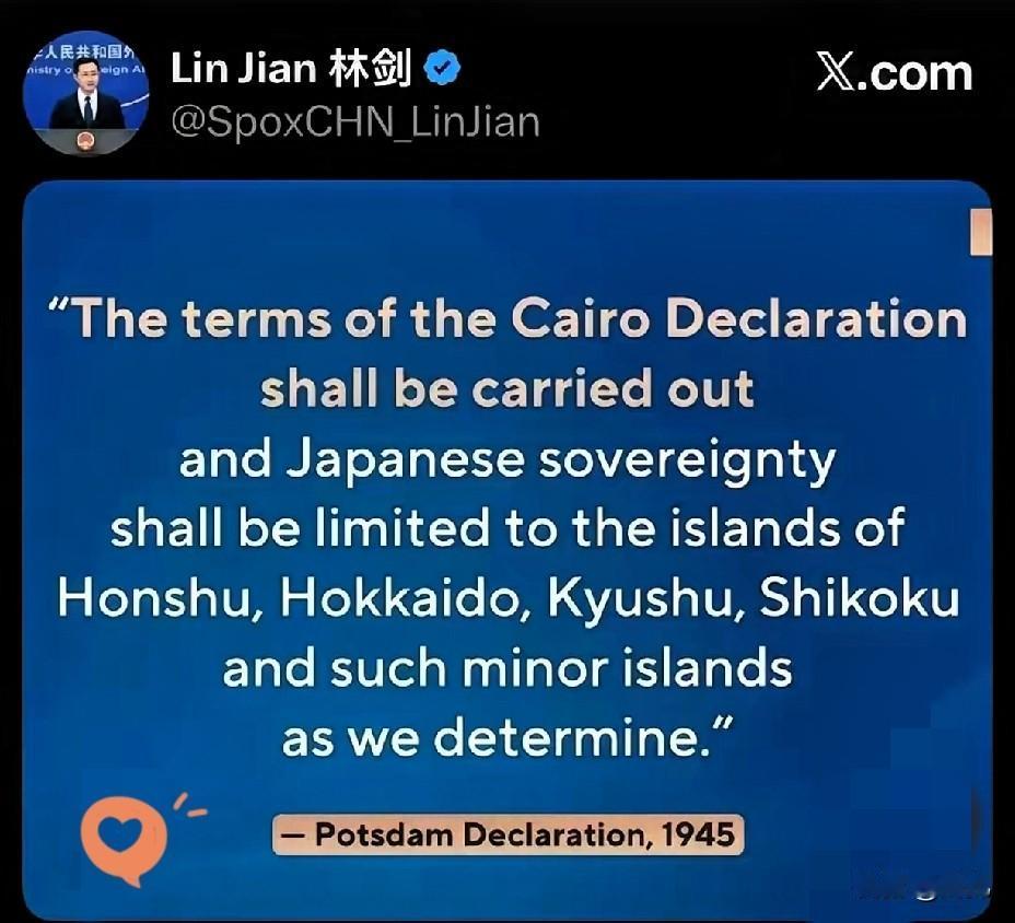 中国直接拿《波茨坦公告》划红线! 日本领土仅限四岛,这波反制太硬气了! 不是我们突然发难,是日方先践踏规则。 一边在台湾问题上频频越界,一边无视二战后国际秩序,现在该让它醒醒了。 《波茨坦公告》写得明明白白,日本主权就限于本州、北海道、九州、四国,其他岛屿轮不到它说了算。这不是报复,是捍卫正义战果。 你不守规矩,就别怪别人拿规矩约束你。国际秩序从不是任人拿捏的软柿子,尊重历史才是自保的唯一出路。 你觉得日方会正视这份公告,收敛越界行为吗?
