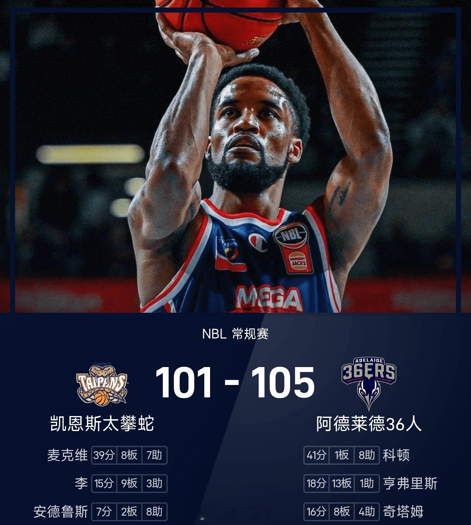 25/26赛季NBL 常规赛,阿德莱德36人对阵凯恩斯太攀蛇。双方全场战罢,阿德莱德36人105-101战胜凯恩斯太攀蛇。科顿砍下全场最高的41分1板8助,率领阿德莱德36人成功取胜。