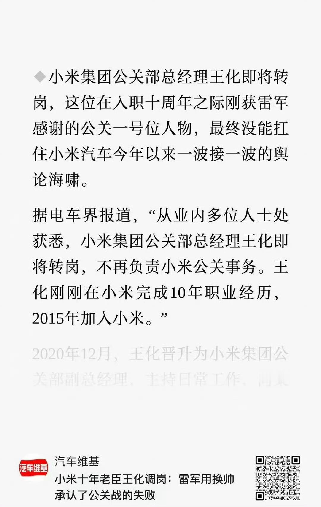 王化 转岗,1号位换人!小米后面的公关思路大概率也要跟着调整了,接下来就看舆情能不能真正处理到位了。其实不管是做企业还是做人,雷总那句话是真有道理,真诚最重要。互联网本来就是个多元场,还是要允许存在一定负面声音,不可能全是夸赞。有人认同,就一定会有人不认同。关键是,被质疑的时候,要真诚地去思考问题的根源。经常看到有些博主挂在嘴边的一句话,小米是招黑体质,这类博主对解决舆情,就不会有太多有效帮助。为啥呢?因为这些博主从一开始就认定,无论什么事,小米都是被黑了。这样就会导致可能真实存在的问题,也会被蒙蔽。相反,只有把有些正确的声音当成改进的方向,问题才能妥善解决。等回头来看,是不是这样吧。