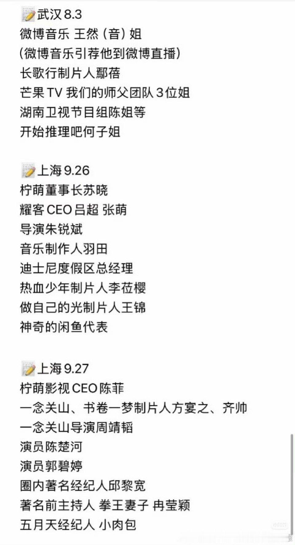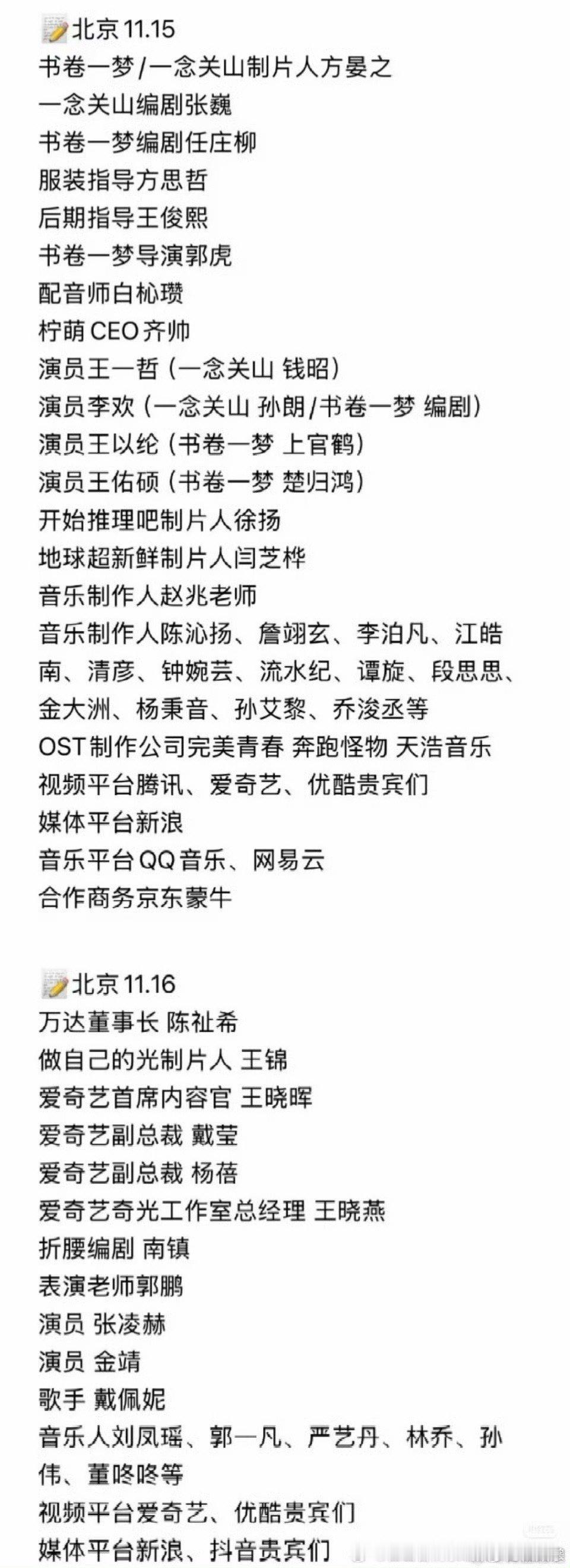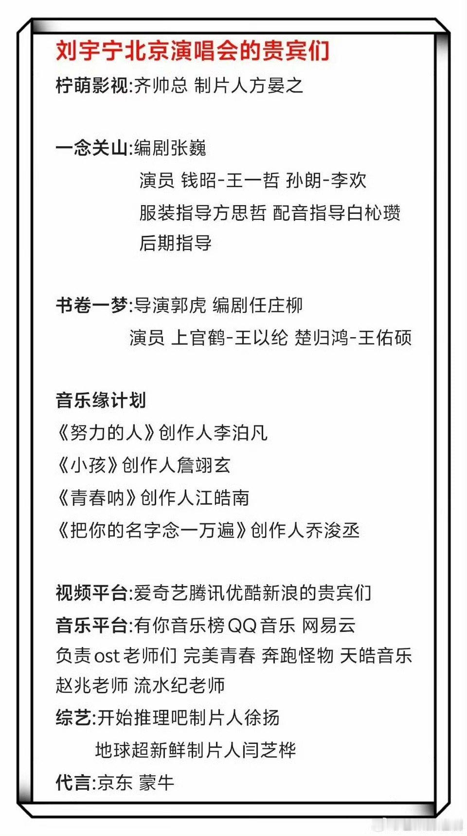 感觉刘宇宁演唱会都快要变成娱乐圈人士时尚单品了,今晚北京演唱会国内几大影视平台和影视大厂高管都来了,演员歌手双栖的刘宇宁星光就是这么强,粉丝把名单一拉出来就感觉好大的排面,人怎么能争气成这样!