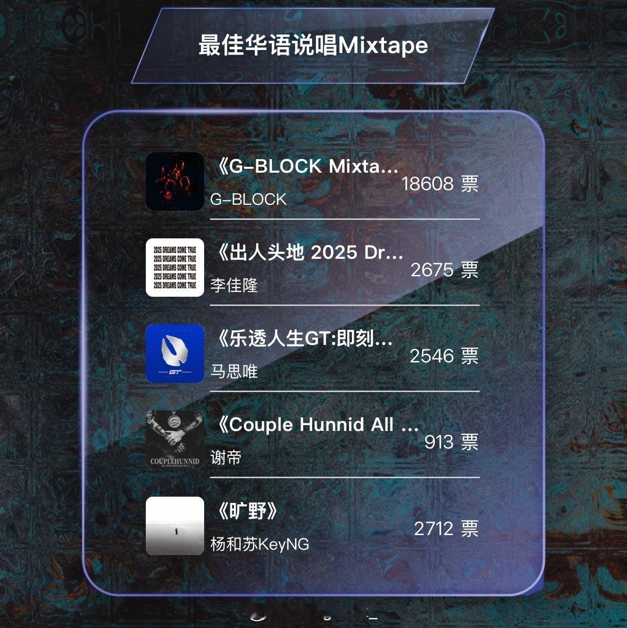 赢麻了🔥不仅仅是GAI,GBLOCK在也中文说唱年度提名投票中断层领先!包括年度最受欢迎团体、年度最佳Mixtape、最佳MV、最佳编曲作品、最佳说唱单曲!!