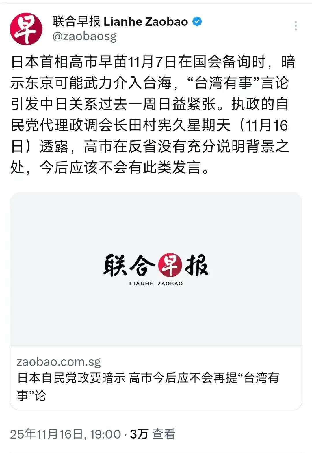 昨晚,自民党代理政调会长田村宪久透露:“高市在反省没有充分说明背景之处,今后应该