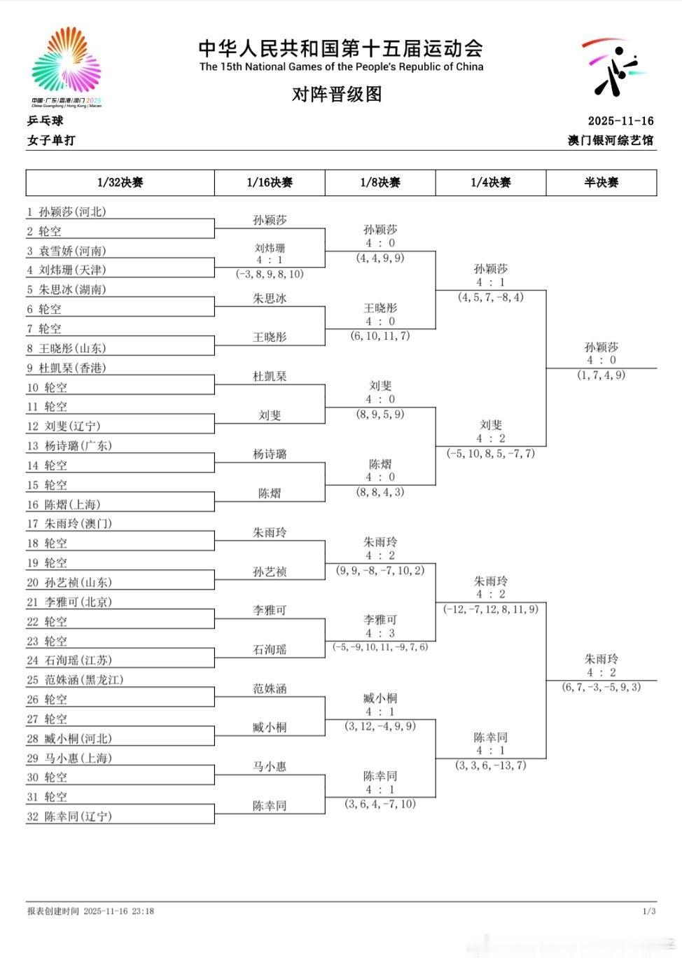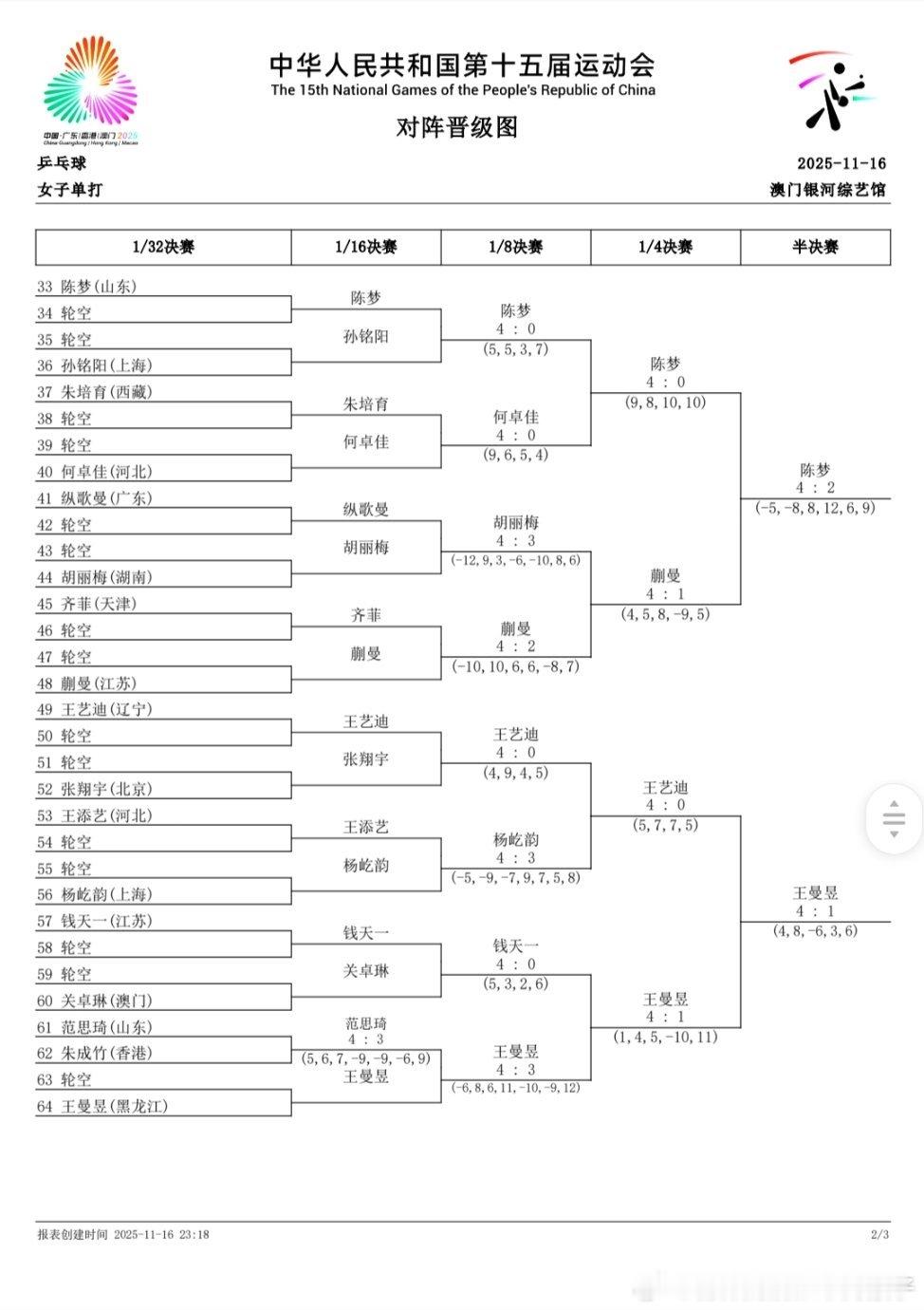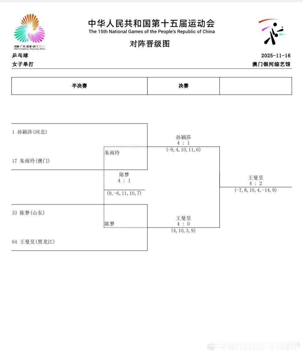 2025年第十五届全运会乒乓球女单项目名次公告:冠军🥇:王曼昱(黑龙江队)教练:张海峰亚军🥈:孙颖莎(河北队)教练:杨广弟季军🥉:陈梦(山东队)教练:吴颢第四名:朱雨玲(中国澳门队)第五名:刘斐(辽宁队)第五名:陈幸同(辽宁队)第五名:蒯曼(江苏队)第五名:王艺迪(辽宁队)