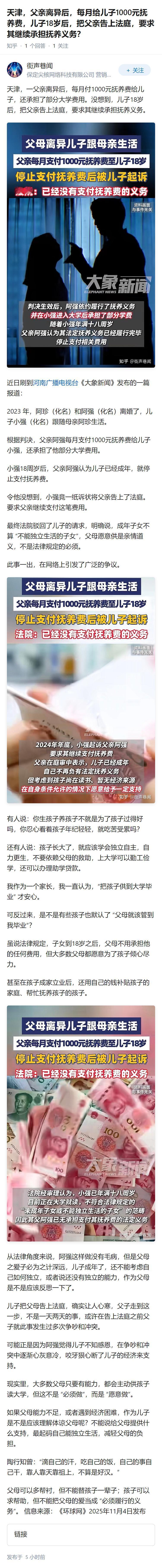 天津,父亲离异后,每月给儿子1000元抚养费,儿子18岁后,把父亲告上法庭,要求