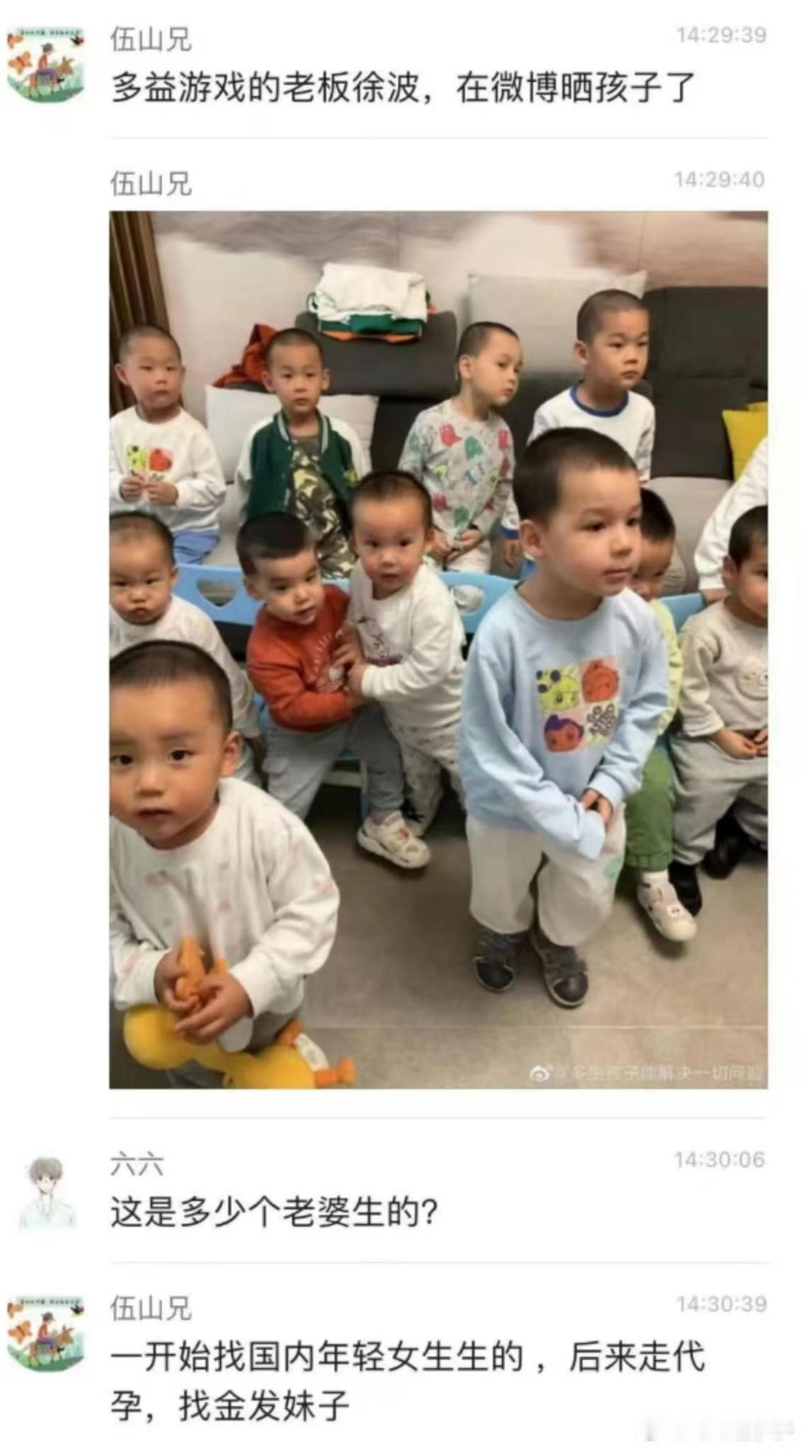 如何看待徐波(煮肘)已经制造了300个子女? 11月15日,徐波前女友在微博发贴,披露这些年徐波已经代孕了300个小孩,数字只少不多。 汤敬称,亲自生产的女儿二妞,已经13岁,从来没有上过学,被父亲控制,她在争取孩子抚养权。 请问如果看待徐波这种疯狂繁育后代的行为,难道真的没有相关法律法规去限制他制造更多孩子吗。已经制造出来的未成年儿童身心健康如何保障,将来会不会性格扭曲成为潜在的社会不稳定因素。 小孩照片还是几年前网上爆出来的 还真有这么多人觉得这是个好事啊? 他这么干唯一好的一点是可以缩小贫富差距带动消费。 一个营的兵大部分人都管不过来,何况是兼职管一个营的小孩子。 他的孩子面临的问题会比留守儿童更严重。 想象一下三百个富养的、留守儿童版煮肘克隆体从小竞争——但凡出一个无敌壬,拿着钱搞搞震,威力绝对不是什么撞大运蹲草丛能比的。