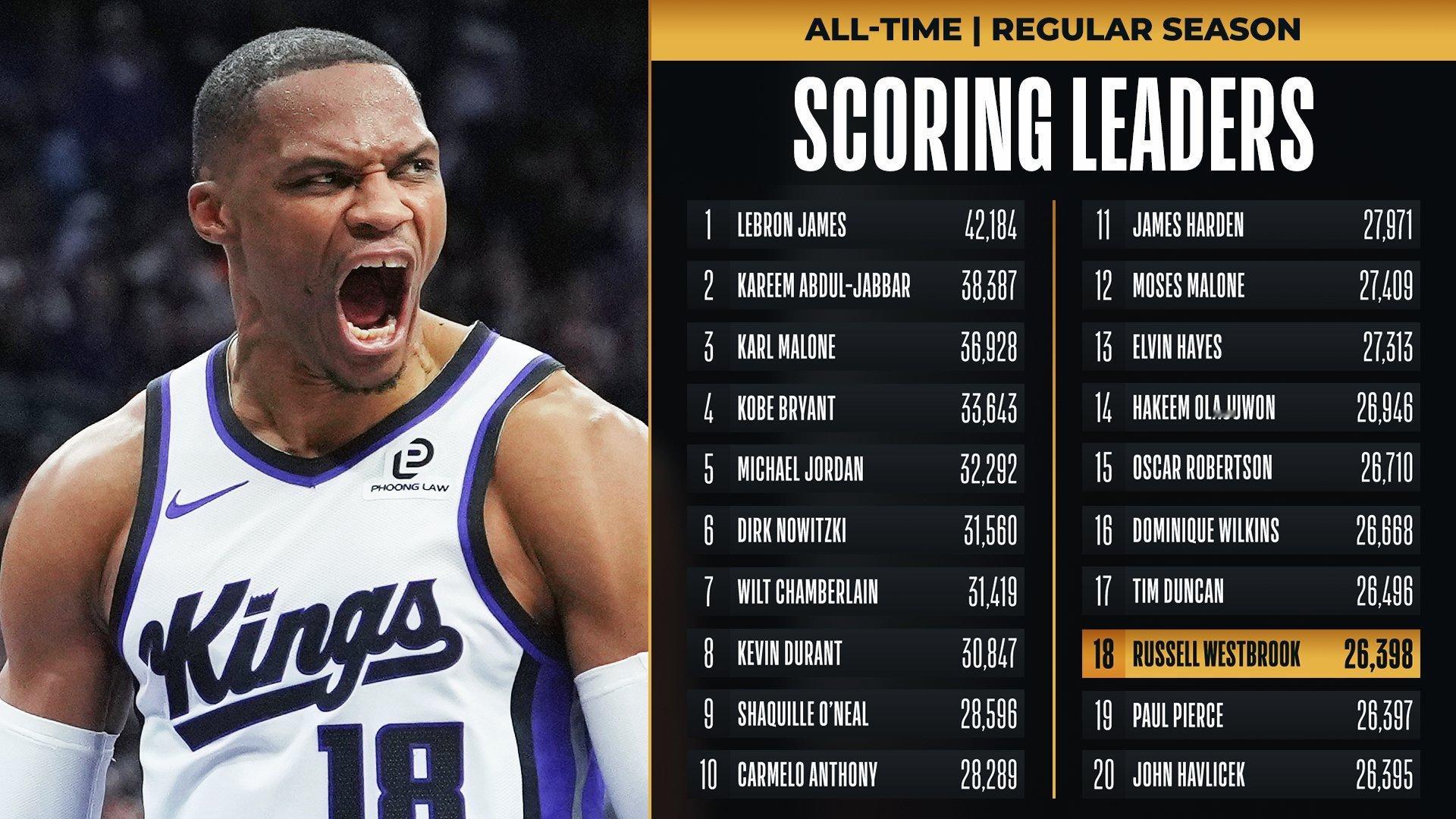 刚刚国王不敌马刺,威少得到14分,他的生涯总得分超越皮尔斯上升至历史第18位。里程悲。