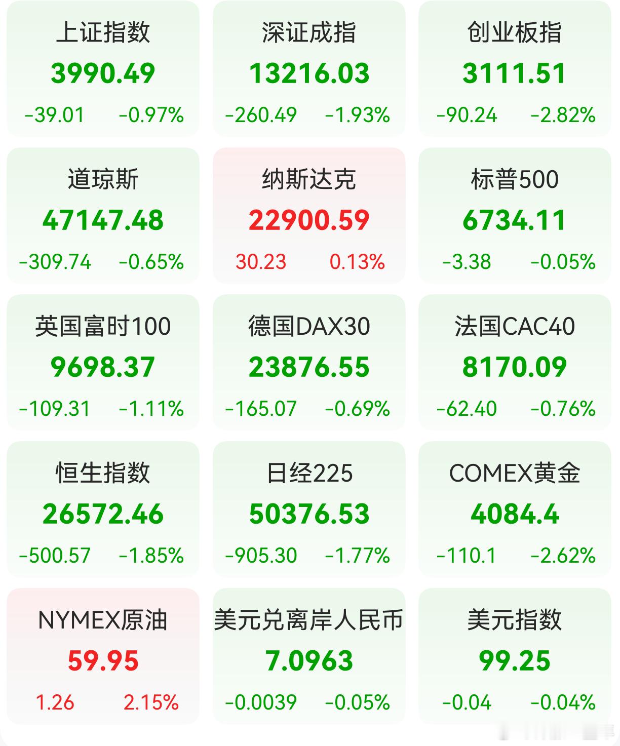 前一交易日,全球主要市场指数情况