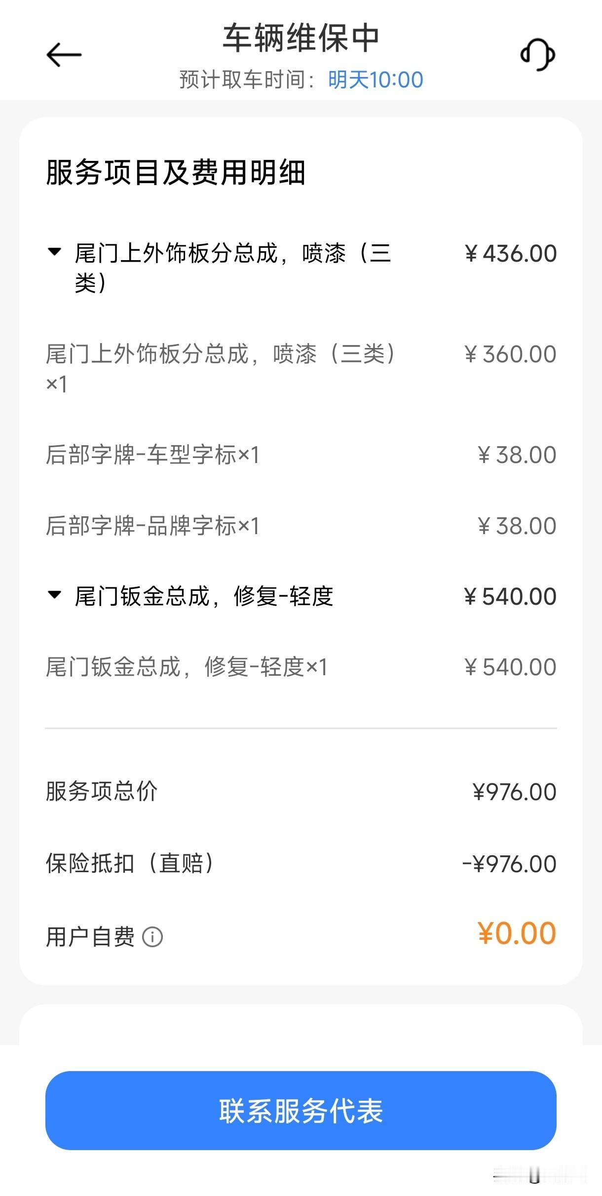 小米YU7 Max车尾维修的官方售后报价,昨天一开始报1660元,后来改到976元。 喷漆360元,钣金修复540元,再加上几个车型字标。我觉得,价格还是可以的。对方保险出。车衣,对方保险赔付1000元。 取送车用上了无忧包,相当于免费。因为,我家离售后80km,自己懒得开。