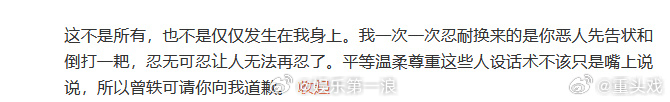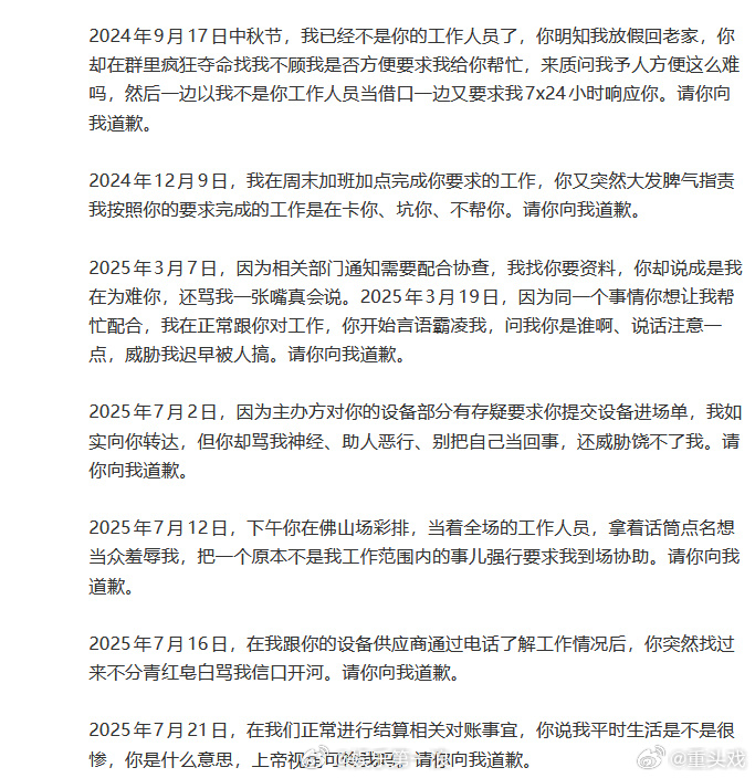前工作人员发文控诉曾轶可,在我跟你共事和合作期间,你多次情绪失控,在公开场合言语羞辱、人身攻击、威胁等系列职场霸凌行为,对我的职业尊严与心理健康造成了严重且持续的伤害。曾轶可,请你向我道歉。
