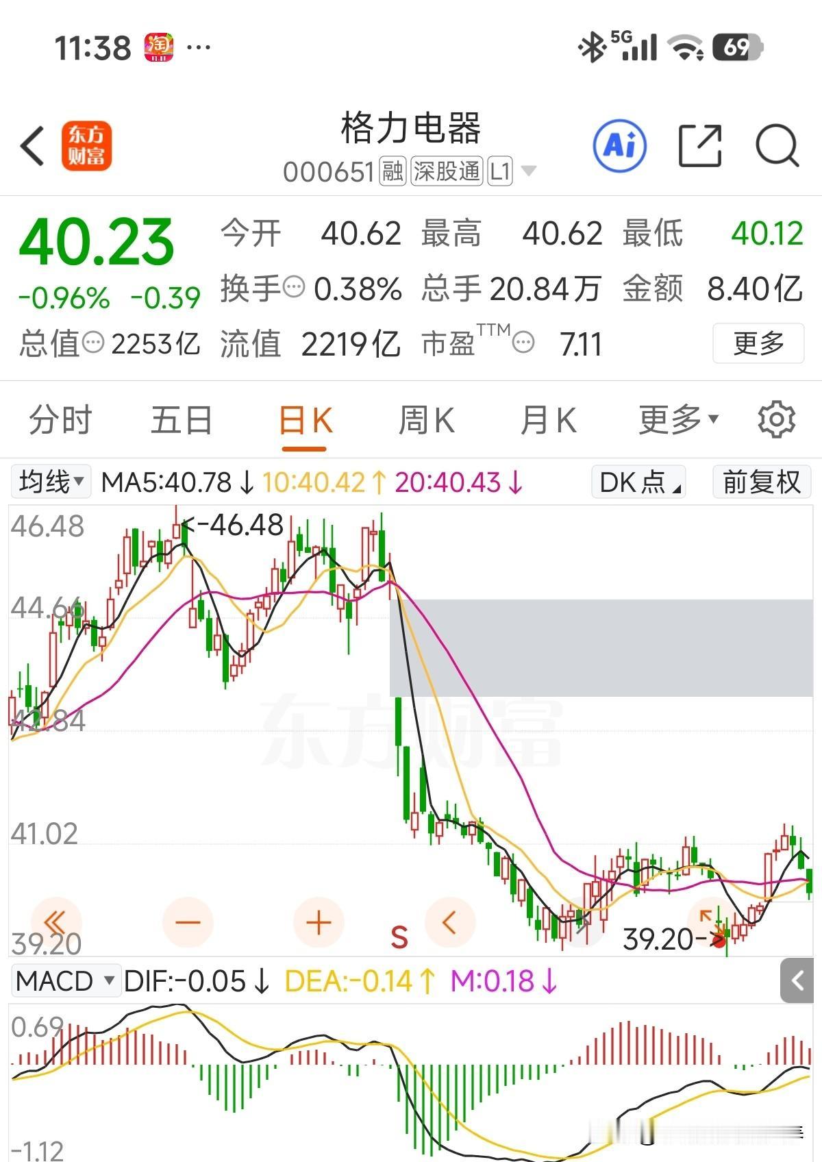 今天是股东大会股权登记日,2个月左右就能收到每股1块的分红了! 股价会不会再破40块,我只知道再次破40元的时候,账上还有资金可以动用! 业绩下滑的利空走势上已经消化差不多了!一波小反弹补了日线小缺口!还剩下一个大缺口需要时间!相信补缺、填权就跟格力电器分红一样,只会迟到不会缺席!