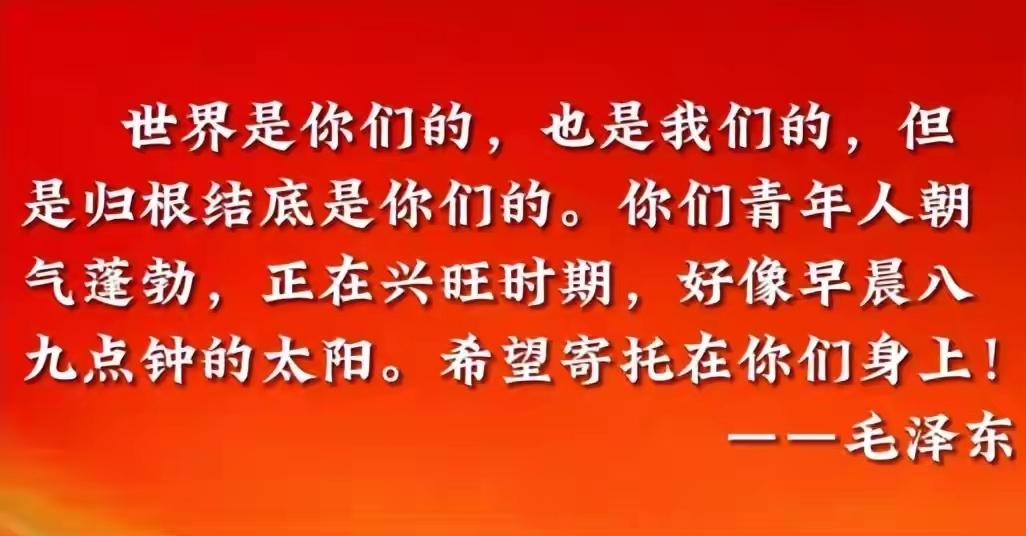 1957年11月17日晚上6时 毛主席在莫斯科访问期间接见留学生 对留学生讲的第一句话就是著名的:“世界是你们的,也是我们的,但是归根结底是你们的。你们青年人朝气蓬勃,正在兴旺时期,好像早晨八、九点钟的太阳。希望寄托在你们身上。” 一句话历经快70年闪耀光芒,依然激励着一代代中华儿女!