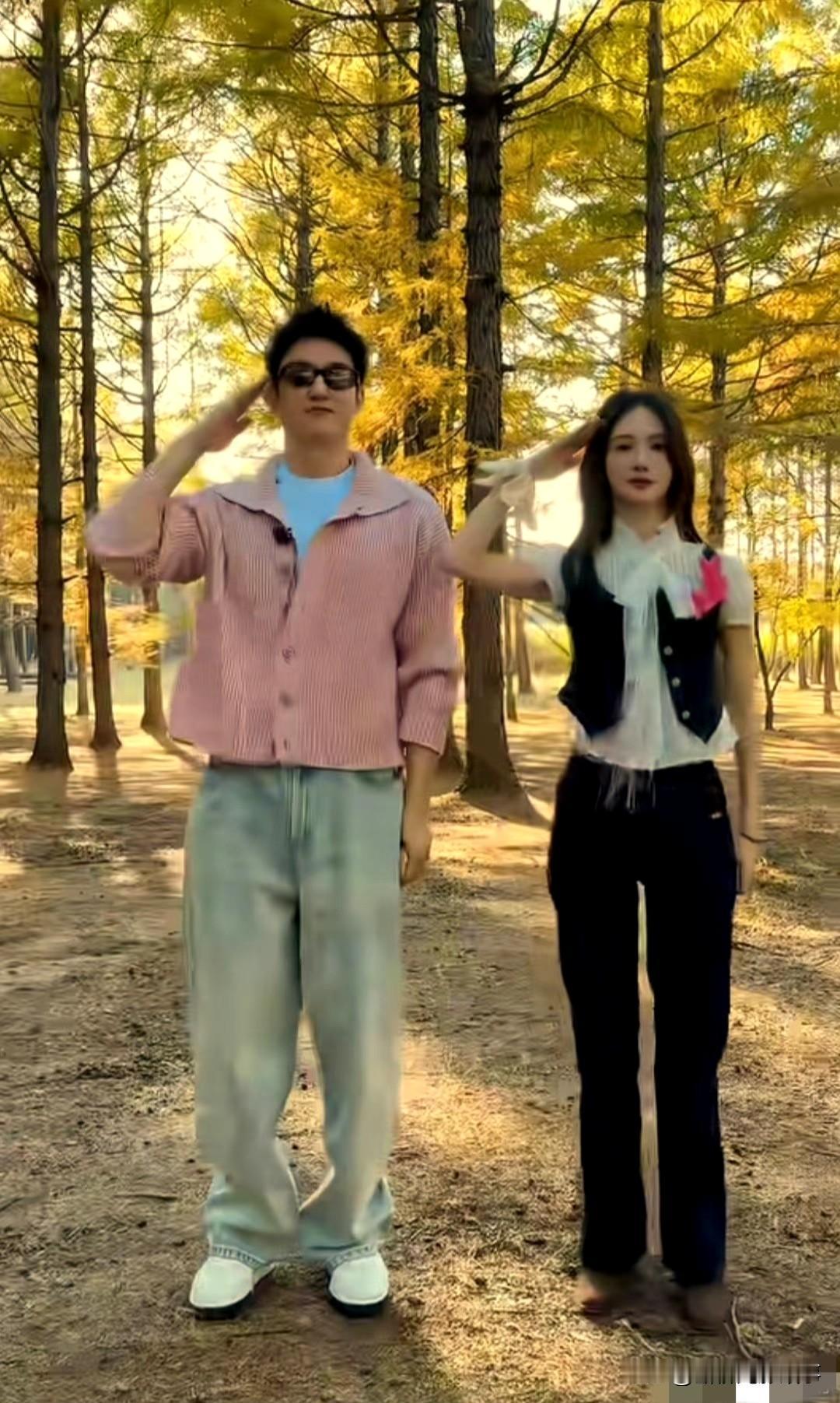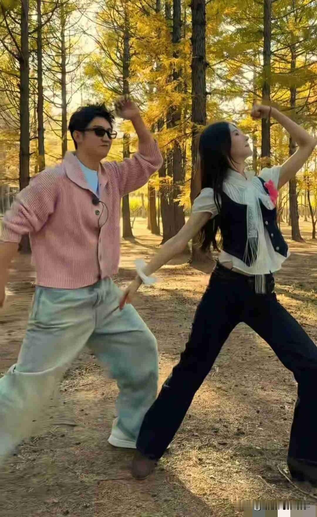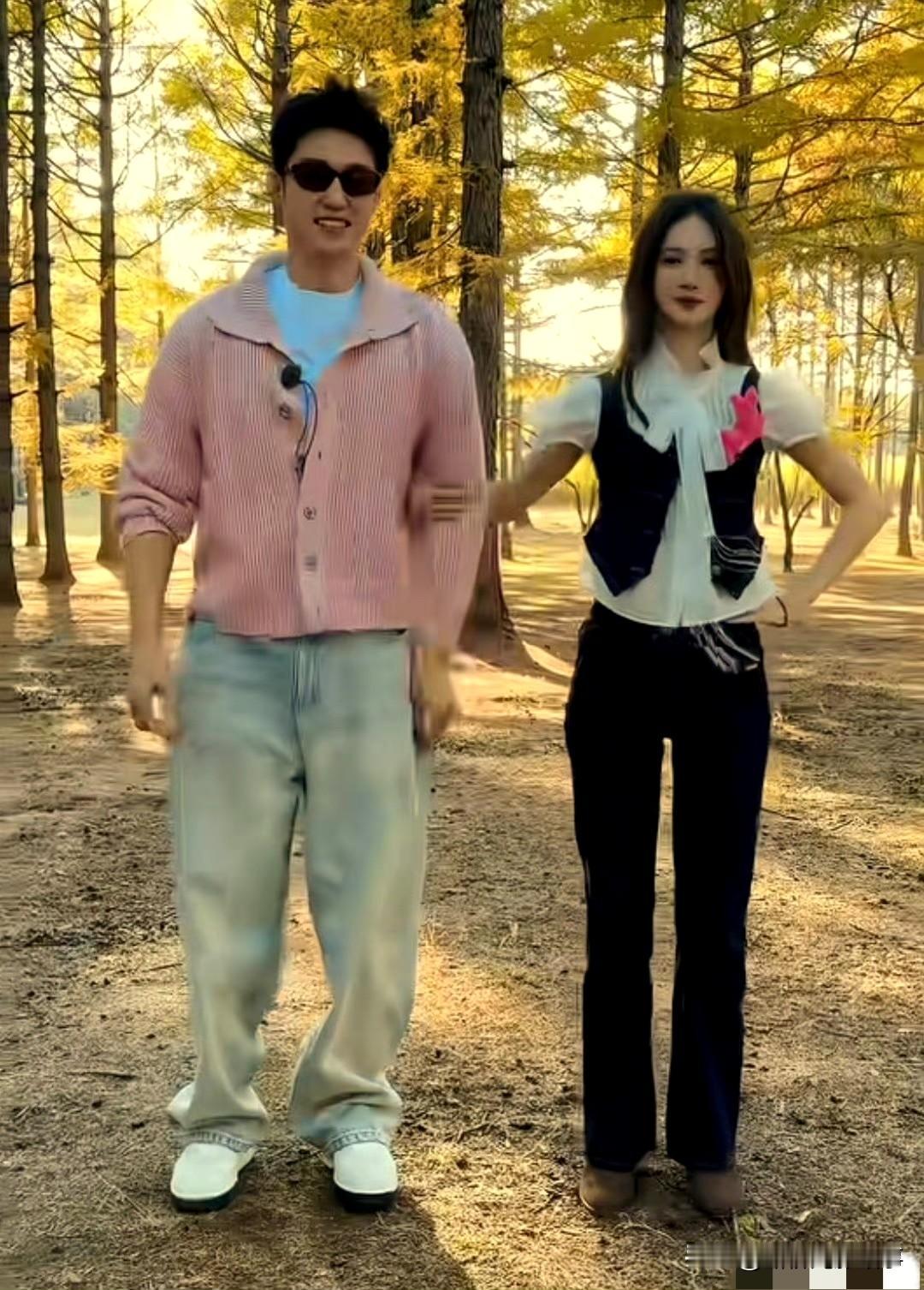 我的今日状态:😁轻松愉快 我这里的天气:🍂微风 秋日树林里的“显眼包”舞蹈:黄景瑜金晨的快乐太 contagious 金黄松树林的光斑里,黄景瑜粉毛衣配墨镜的“酷哥”范儿,撞上金晨流苏马甲的灵动,居然是同步劈叉、敬礼的搞怪舞蹈。 肢体幅度大到带风,表情却一本正经,反差感把“松弛感综艺感”焊在了画面里——没有精致摆拍,只有俩人疯闹的松弛,连树林的秋意都跟着轻快起来。 这哪是跳舞,是把“快乐具象化”给观众看啊。