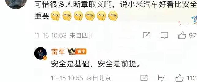 小米汽车创始人雷军连发微博回应“小米汽车好看比安全重要”!安全高于一切,安全是基