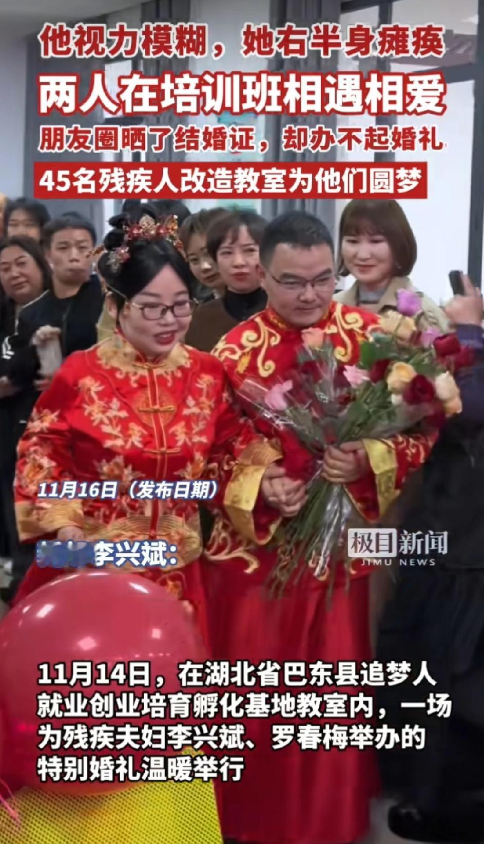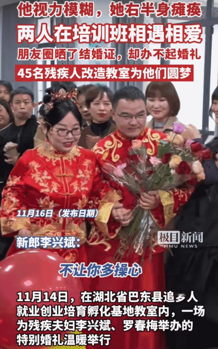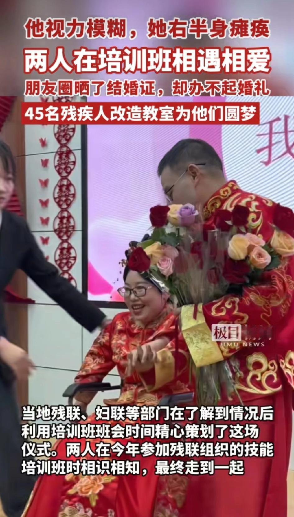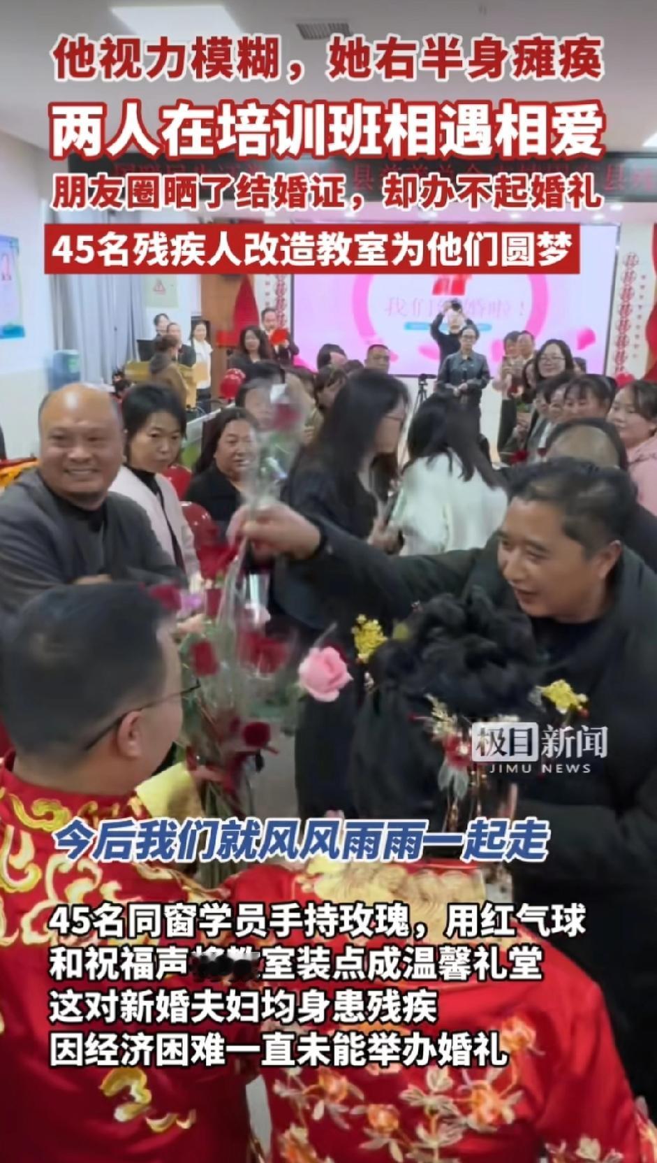 “太感动了!”湖北,一对夫妻举行了一场特殊的婚礼,45名残疾人改造教室为他们圆梦。 残疾夫妇李兴斌和罗春梅是在培训班相遇相爱的。朋友圈晒了结婚证,却办不起婚礼。 当地残联和妇联等部门得知后,利用培训班班会时间,给他俩策划了一场婚礼。45名残疾人同窗手持玫瑰花和红气球将教室装饰成礼堂,举行了特别温馨的婚礼。 感恩遇见,希望他们以后生活充满阳光!祝福他们!